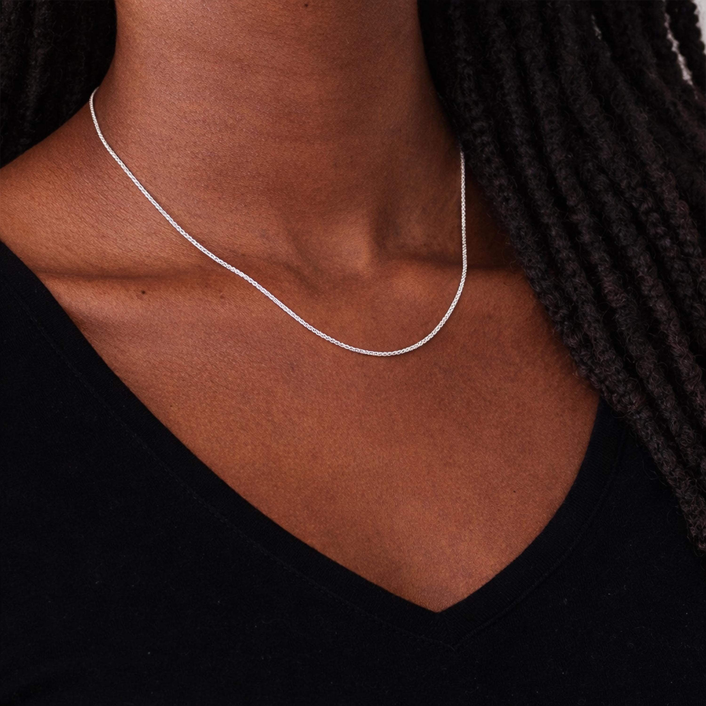 The spiga, also known as a wheat chain, is formed from closely interwoven links that create a smooth, rounded profile with excellent strength and flexibility. At 1.5mm wide, this chain has a fine, elegant appearance while still feeling secure and well made. It sits comfortably against the skin and reflects the light softly, making it ideal for wearing alone or pairing with a pendant or locket.