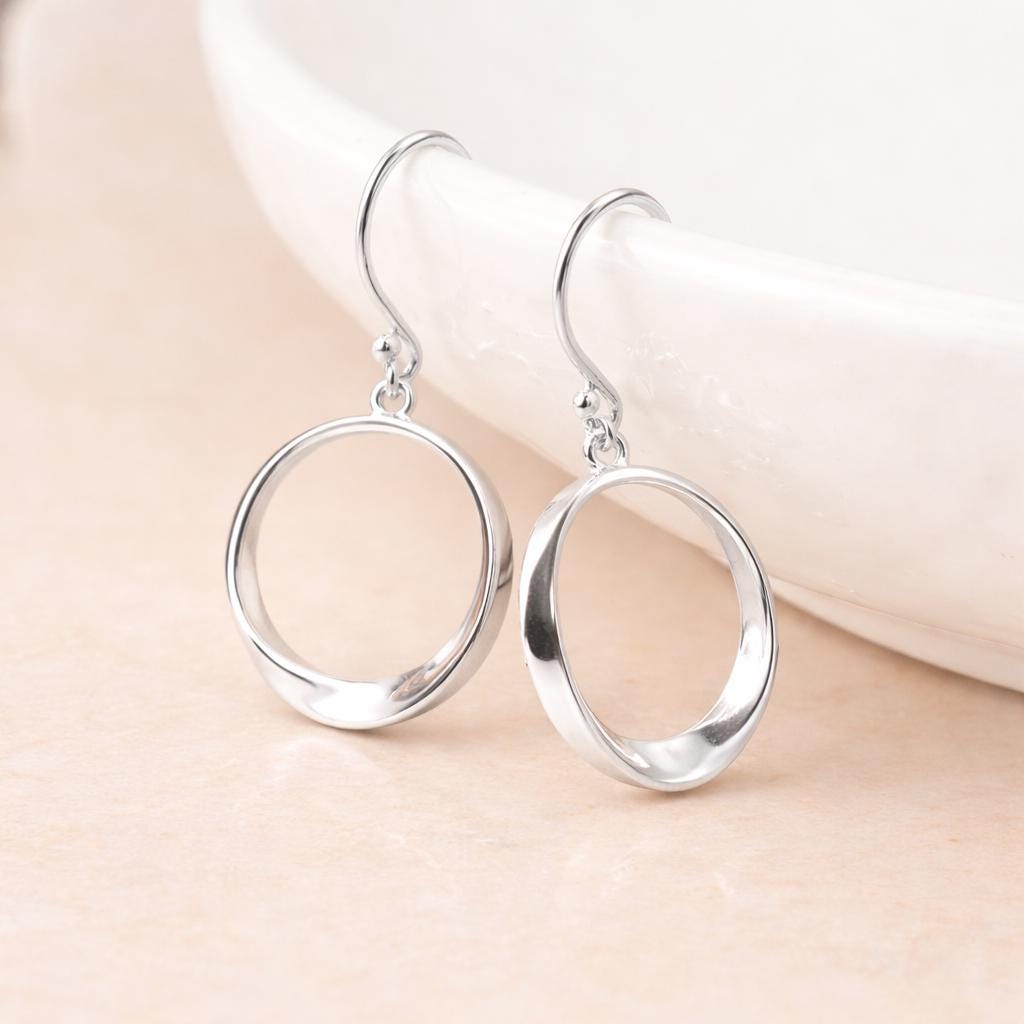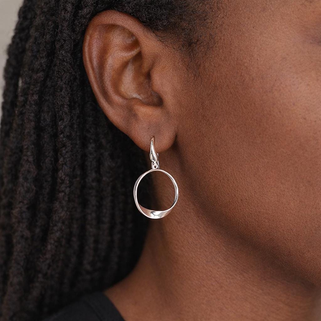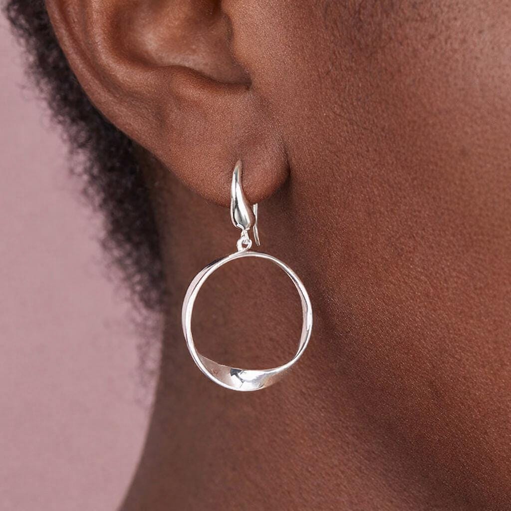 These sterling silver drop hoop earrings are a refined statement design, handcrafted from solid 925 sterling silver with a softly sculpted circular hoop that catches the light beautifully as you move.