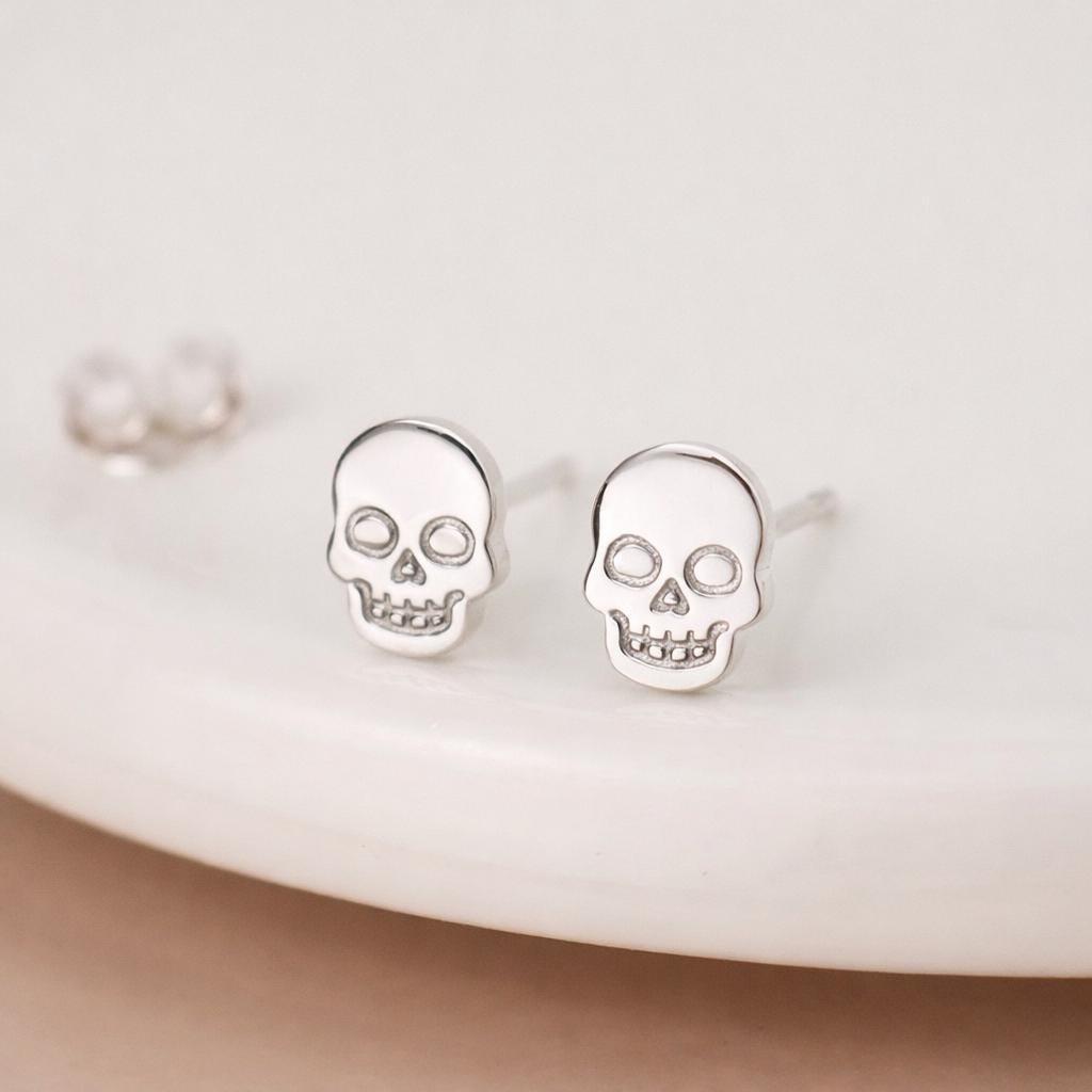 These sterling silver skull stud earrings are handcrafted from solid 925 sterling silver and finished with a smooth, polished surface that highlights the clean lines of the skull design.