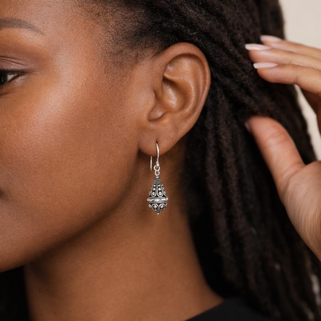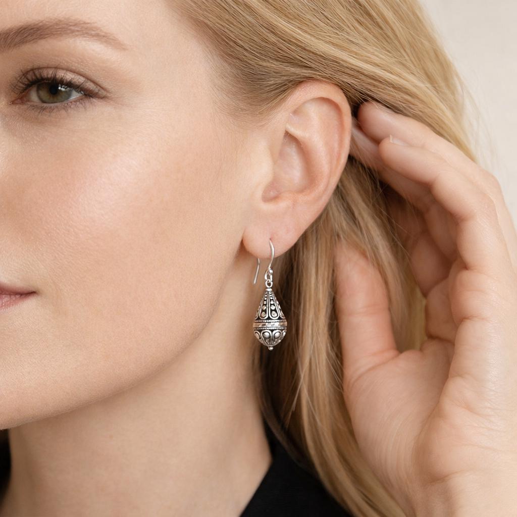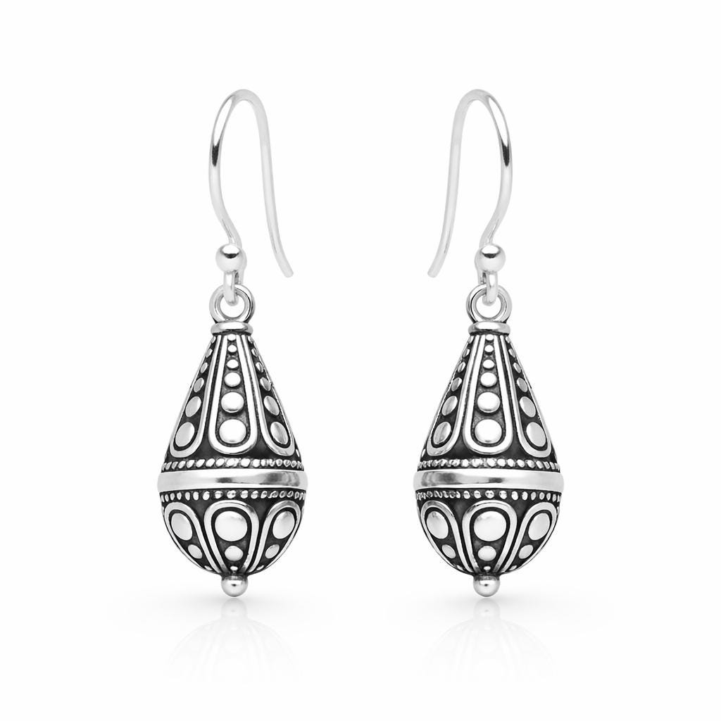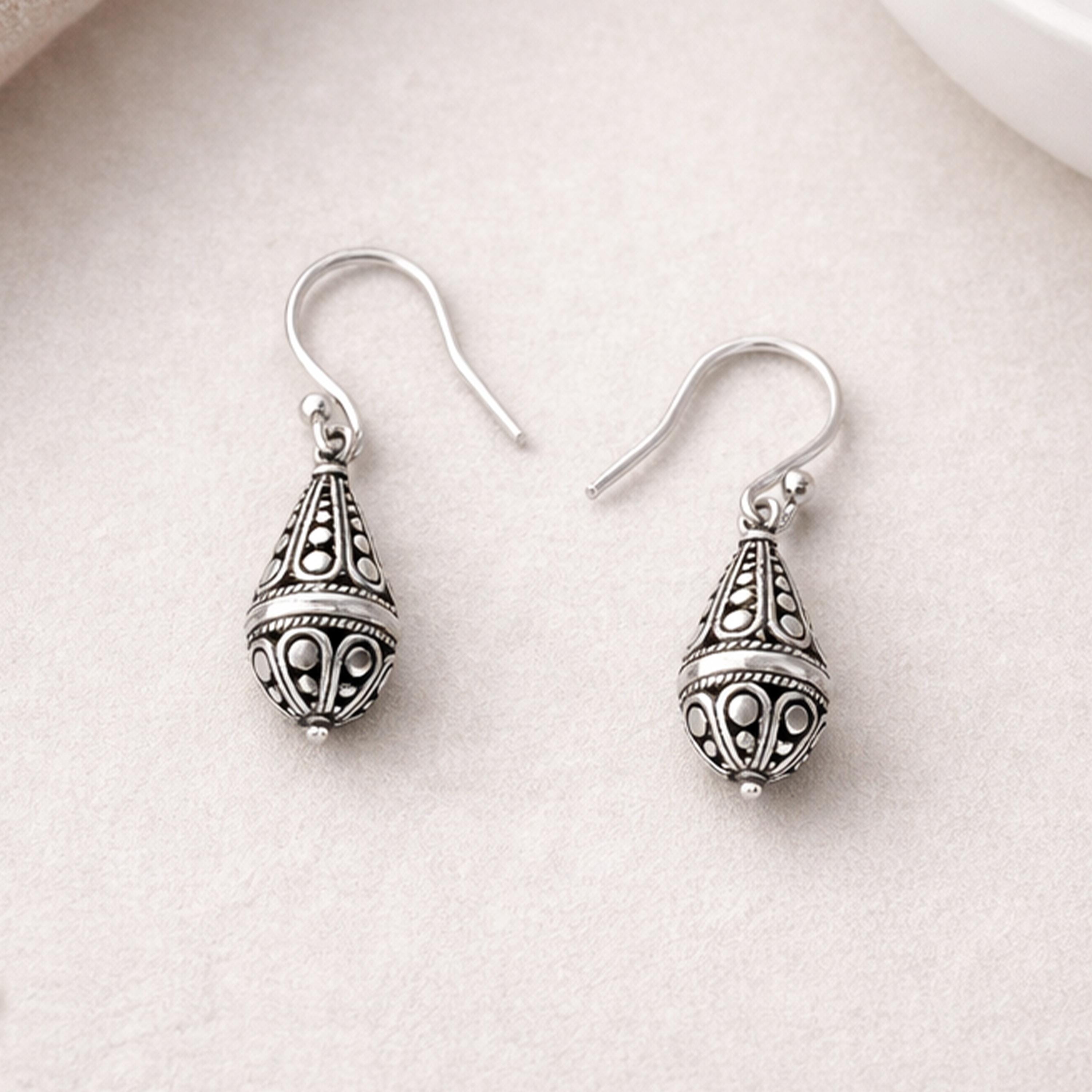 These sterling silver Balinese drop earrings are handcrafted from solid 925 sterling silver, featuring beautifully detailed bead charms inspired by traditional Balinese design.