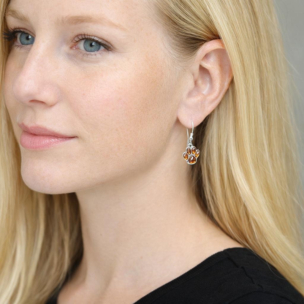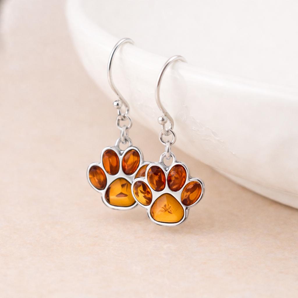 These sterling silver paw print earrings are handcrafted from solid 925 sterling silver and set with genuine honey-coloured Baltic amber, making them a meaningful tribute for animal lovers and pet memorial jewellery.