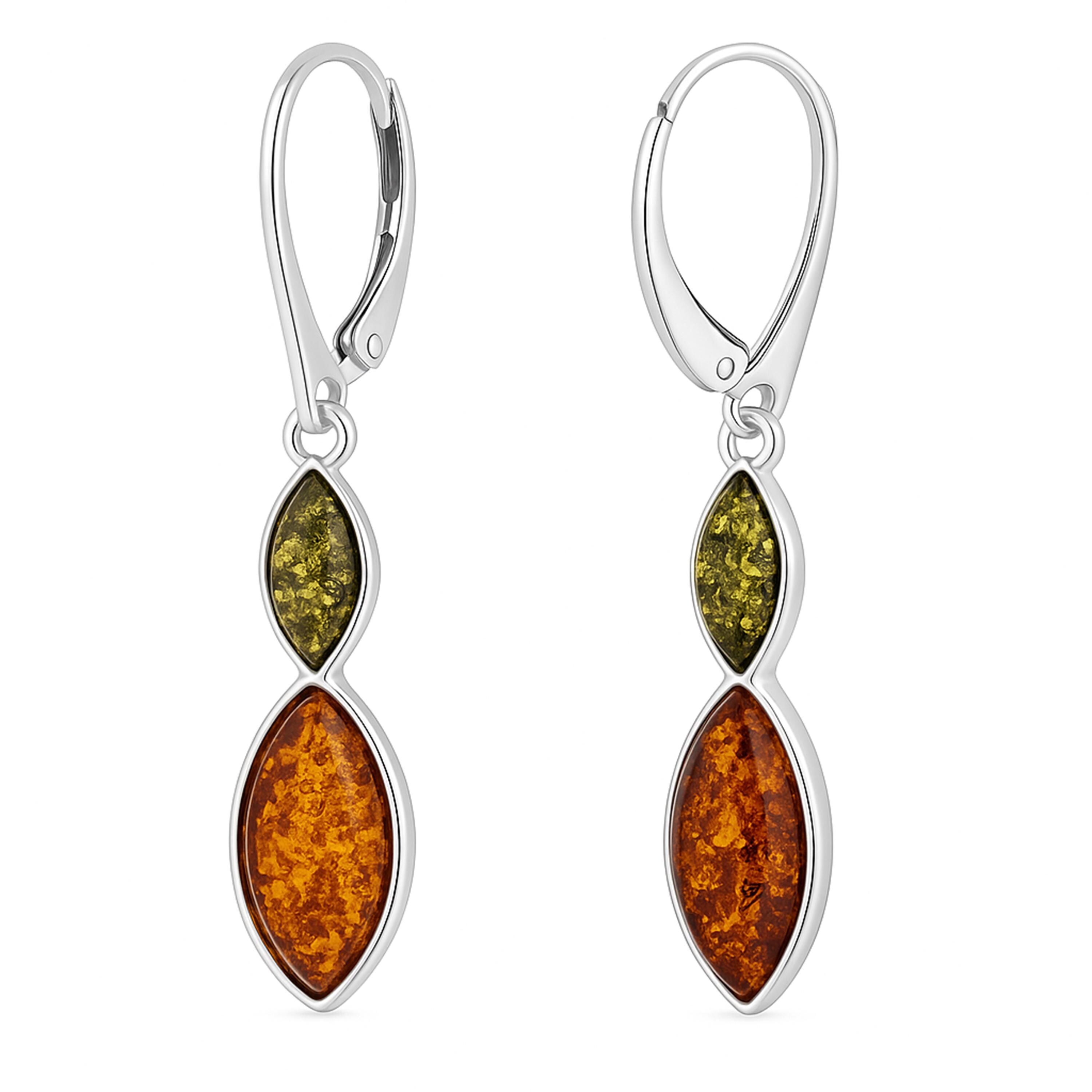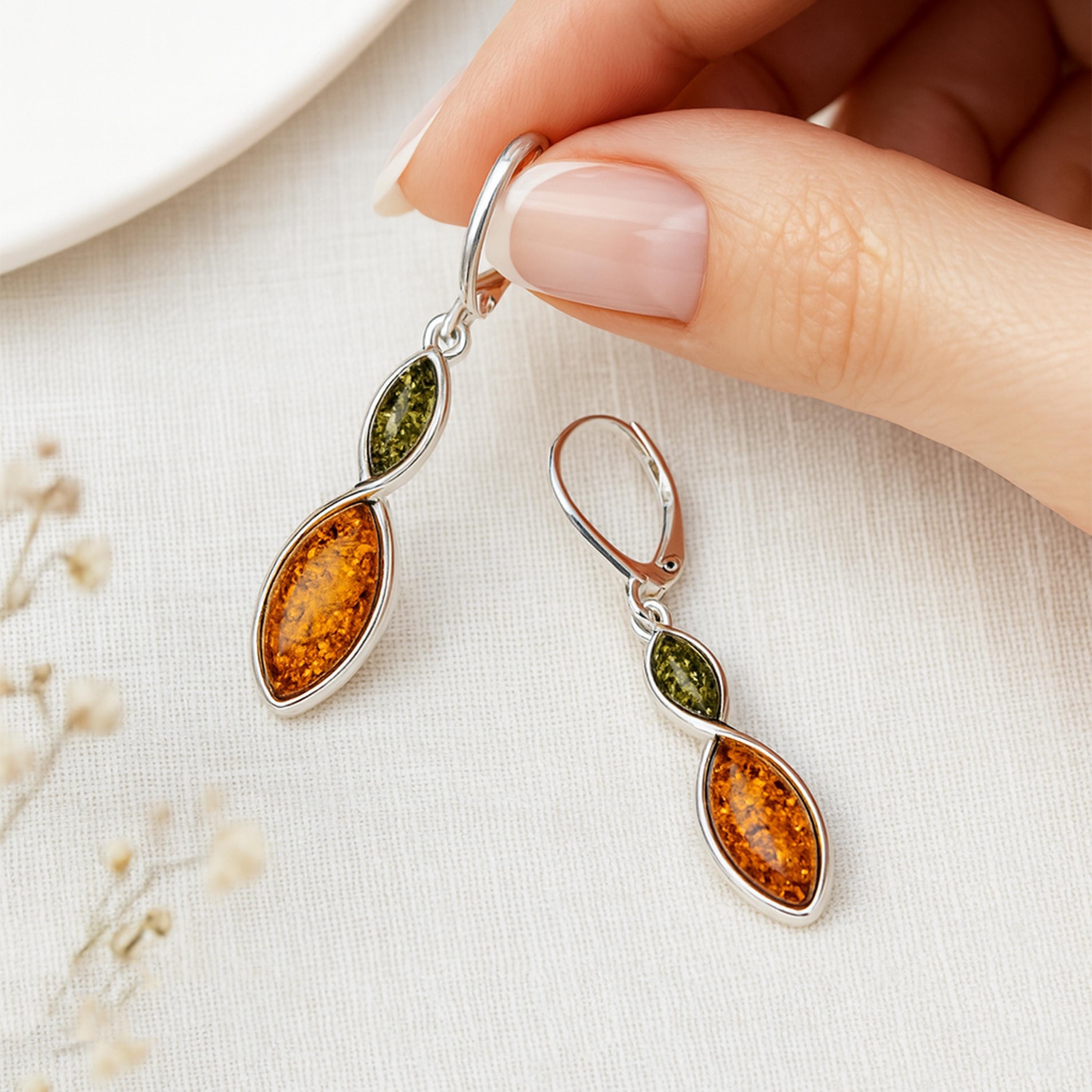Handmade from solid 925 sterling silver, each earring features two marquise-shaped Baltic amber stones: a warm golden amber below and a unique green amber above. Measuring 50mm high by 10mm wide and weighing approx. 5.34g, they’re lightweight enough for comfortable wear yet bold enough to stand out. The lever-back fastening ensures secure, easy wear, making them ideal for evenings, anniversaries, or everyday elegance.