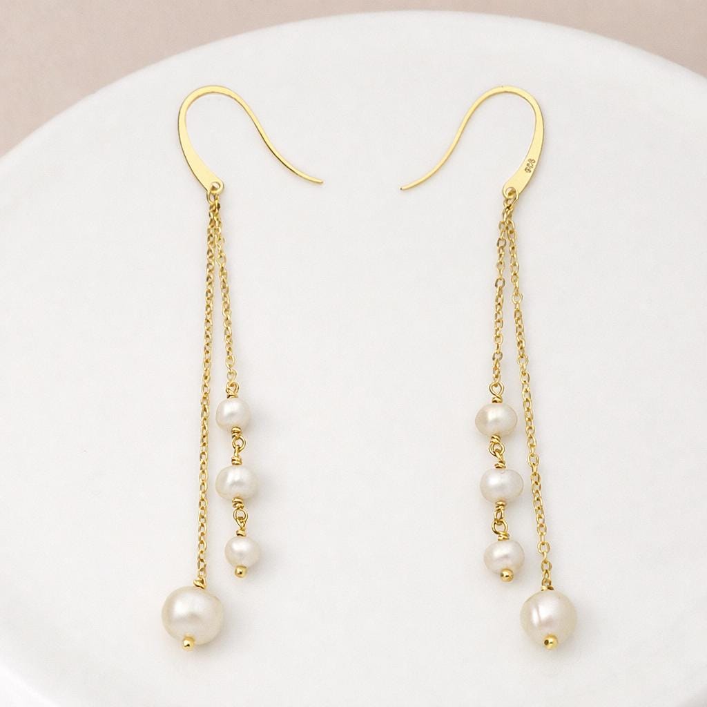 Each pair features fine gold-plated chains accented with naturally unique freshwater pearls in graduating sizes. The elongated drop creates graceful movement when worn, while the pearls add a classic, timeless feel. Lightweight and fluid, they are comfortable to wear despite their length.
