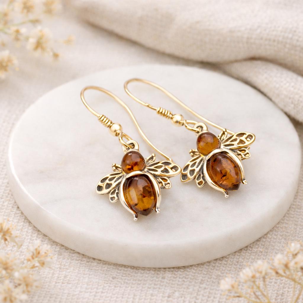 Charming, nature-inspired, and eye-catching — these gold-plated sterling silver Baltic amber bee earrings are the perfect gift for bee lovers and jewellery collectors.