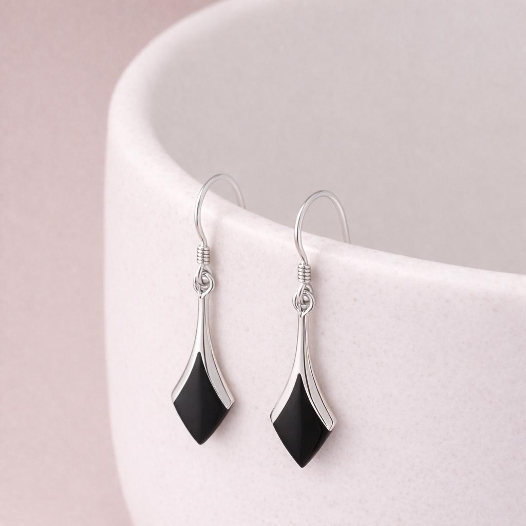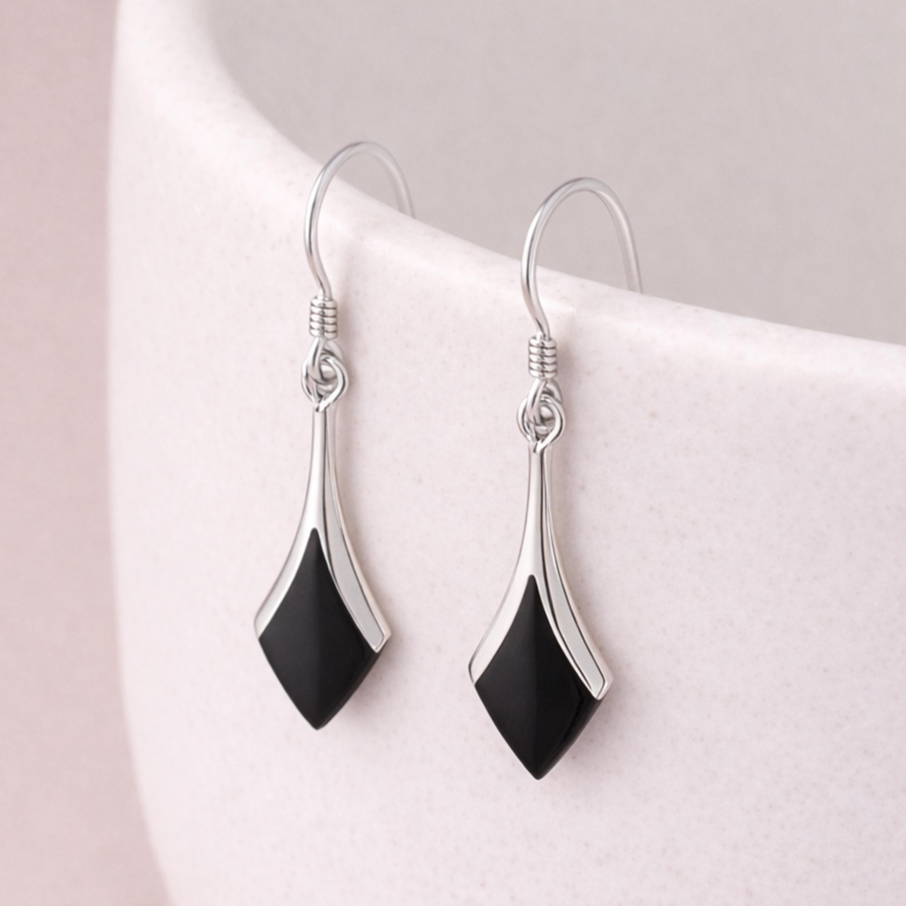 Each pair is made in small batches, with the onyx stones carefully selected and polished to a smooth, high shine finish. The elongated diamond shape creates a flattering drop that moves gently with the wearer, making them ideal for both everyday wear and evening styling.