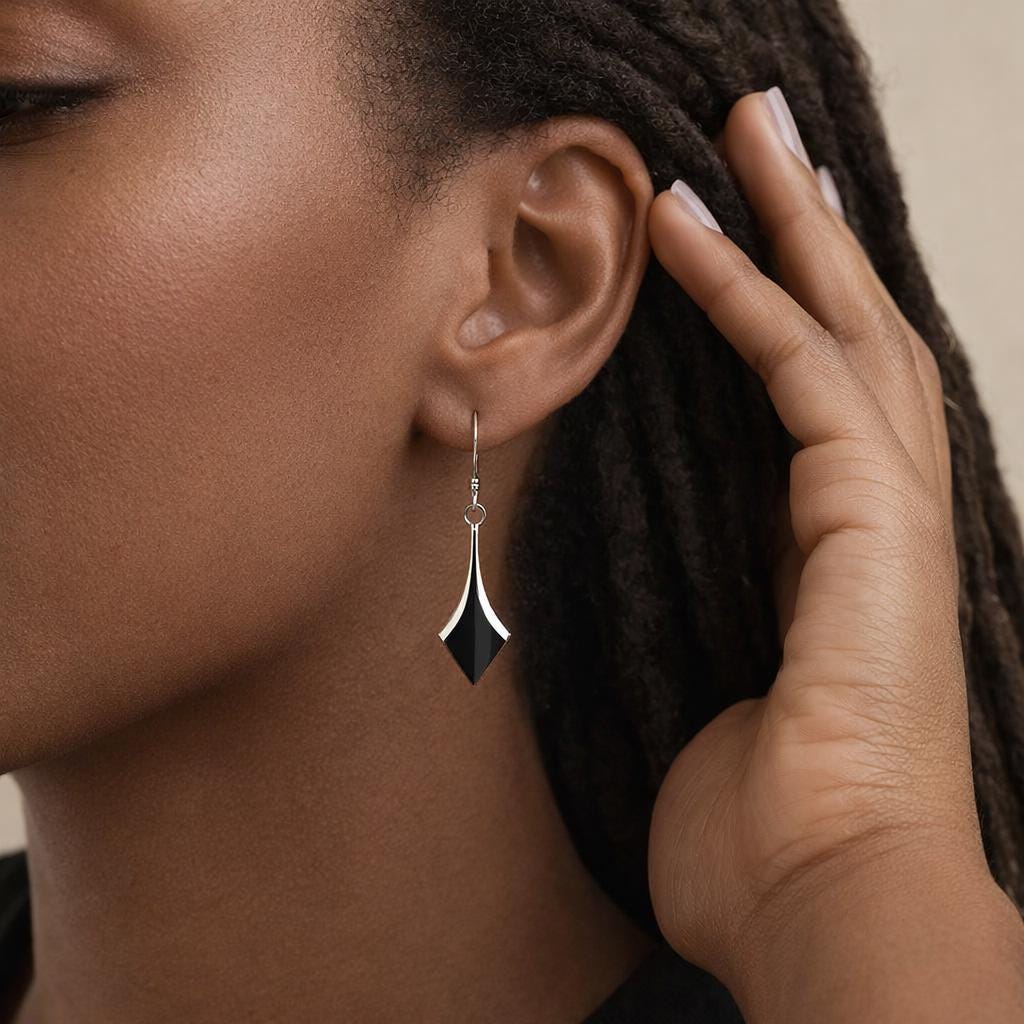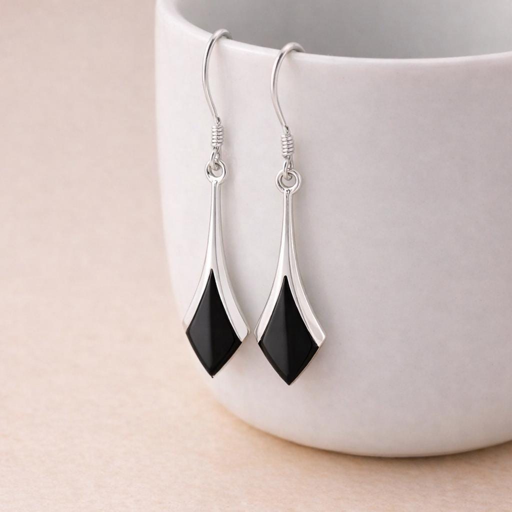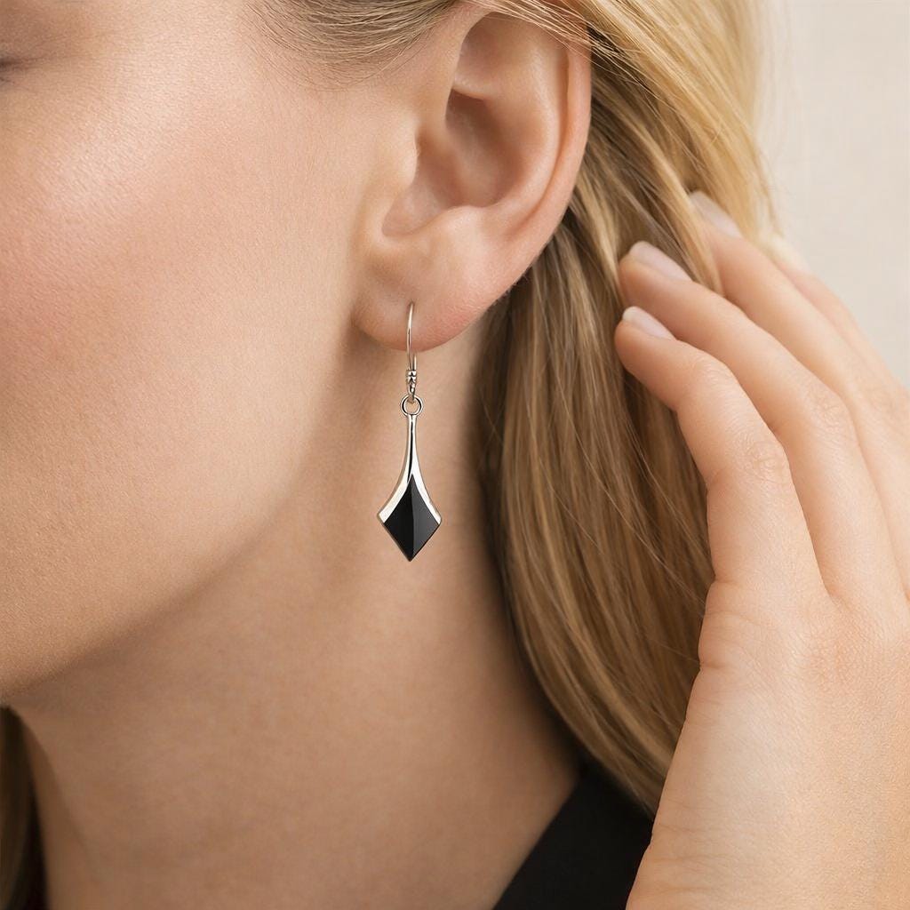 Each pair is made in small batches, with the onyx stones carefully selected and polished to a smooth, high shine finish. The elongated diamond shape creates a flattering drop that moves gently with the wearer, making them ideal for both everyday wear and evening styling.