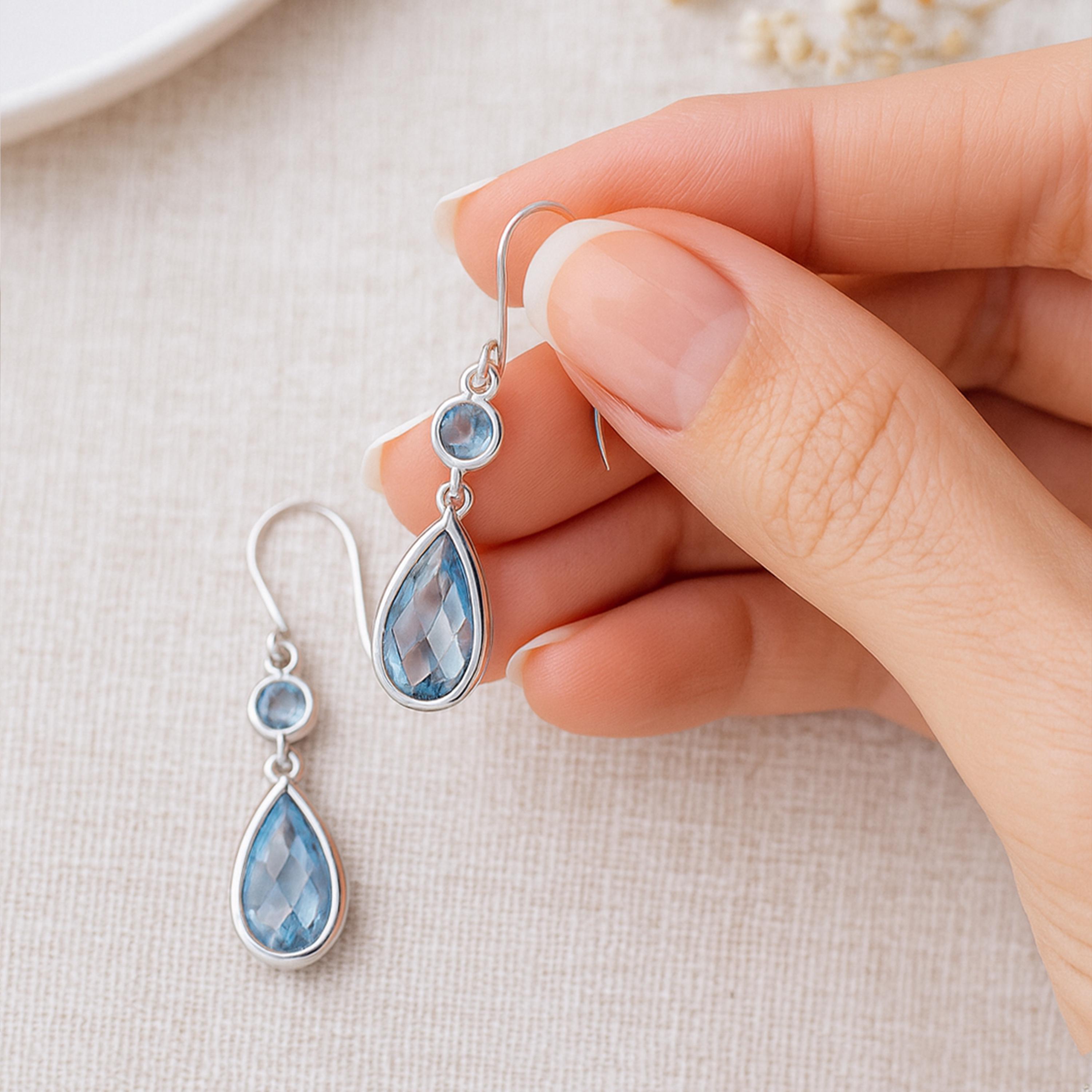Handmade from solid 925 sterling silver, each earring features a round-cut blue cubic zirconia above a larger faceted teardrop stone, both set in polished silver. Measuring 33mm high by 12mm wide and weighing approx. 4.20g, they strike the perfect balance between statement and lightweight comfort. A gorgeous gift for birthdays, anniversaries, bridesmaids, or anyone who loves elegant gemstone jewellery.