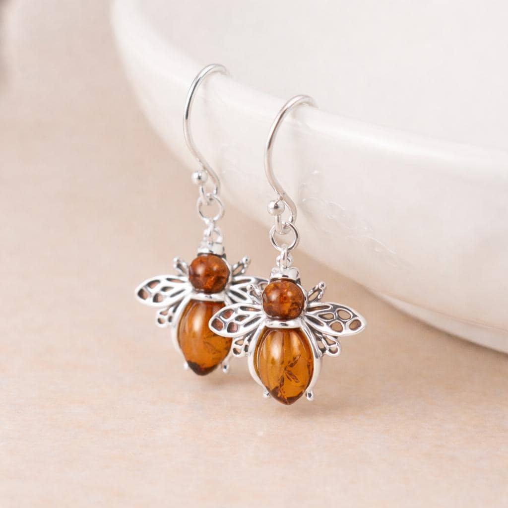 These sterling silver bee drop earrings are handcrafted from solid 925 sterling silver and set with genuine honey coloured Baltic amber, creating a playful yet elegant nature-inspired design.