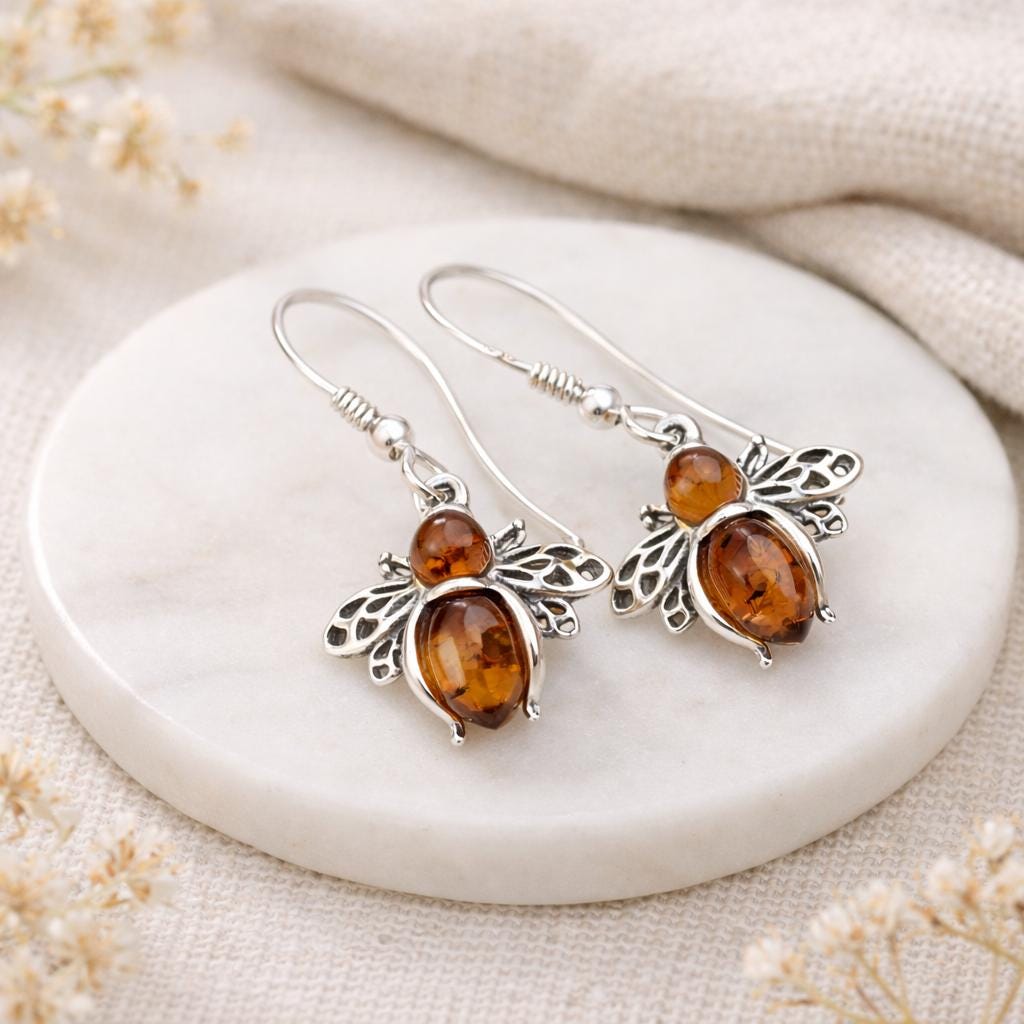 These sterling silver bee drop earrings are handcrafted from solid 925 sterling silver and set with genuine honey coloured Baltic amber, creating a playful yet elegant nature-inspired design.