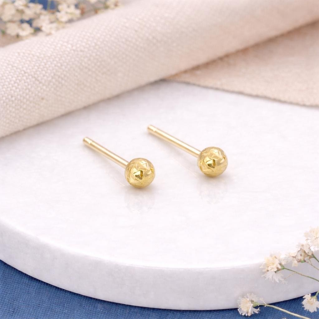 These 9ct yellow gold ball stud earrings are crafted from solid 9ct gold, featuring a softly diamond cut 4mm gold sphere that catches the light with subtle sparkle.