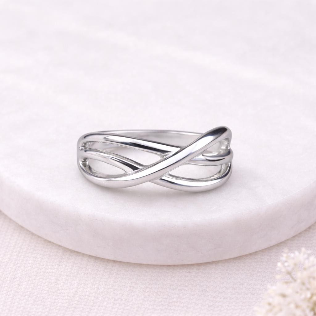 This infinity crossover ring is crafted from solid 925 sterling silver and designed with softly flowing, interwoven bands that cross at the centre.