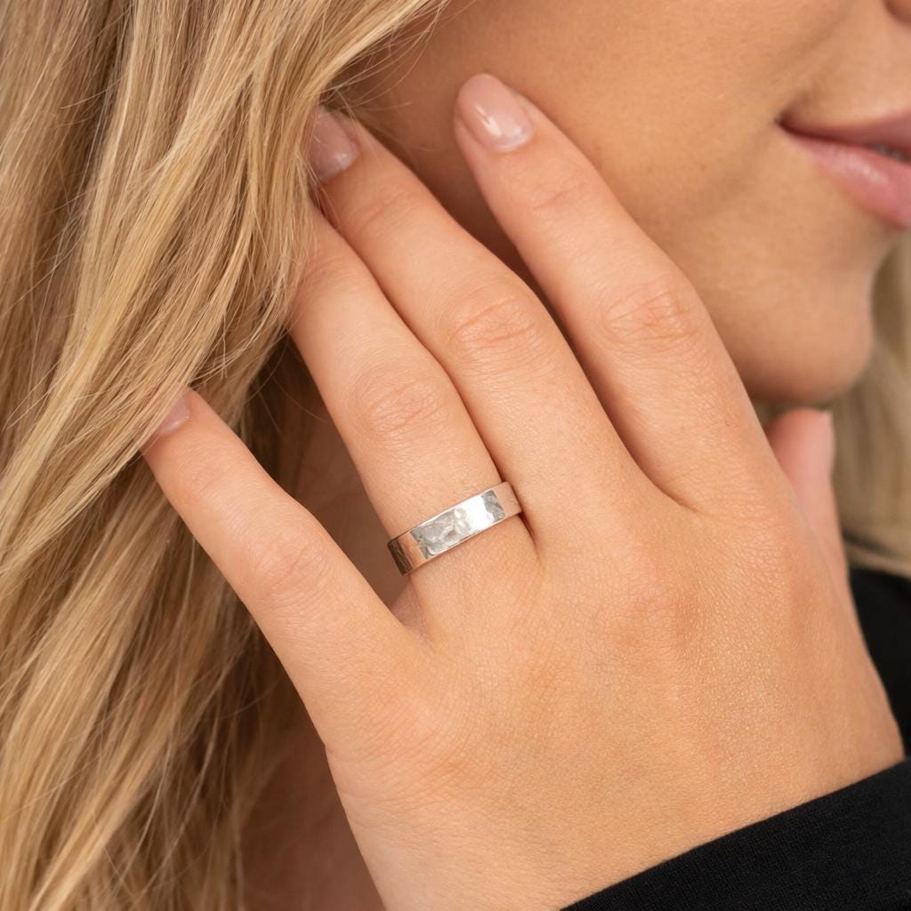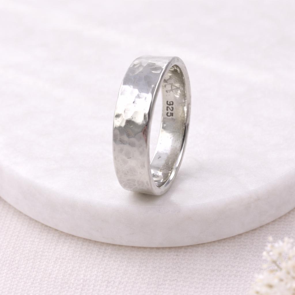 Each ring is individually finished, meaning no two will ever look exactly the same. Subtle variations in the hammered texture are part of its handcrafted charm.