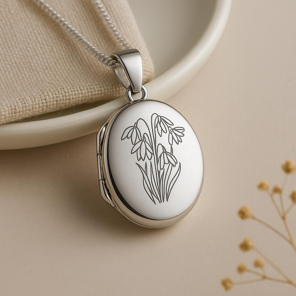 Handcrafted in solid 925 sterling silver, the oval locket features an intricate snowdrop engraving on the front, representing hope and new beginnings. Measuring 20mm high and weighing approx. 3.40g, it opens to hold a cherished photo or keepsake inside. For an extra-special touch, the back can be engraved with initials, names, dates, or a short message, turning this into a truly personal piece.