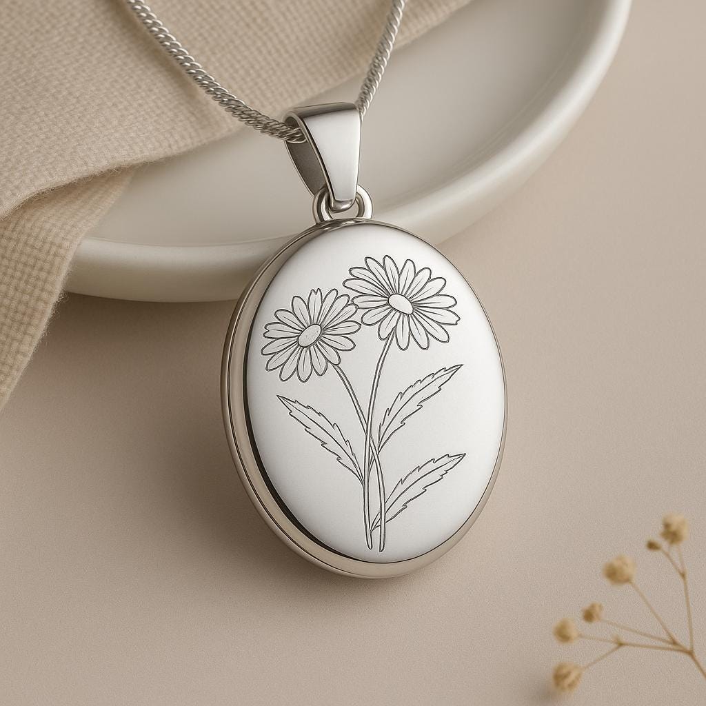 Handcrafted in solid 925 sterling silver, the oval locket is engraved on the front with April’s birth flower — the daisy, symbolising innocence, purity, and new beginnings. Measuring 20mm in height and weighing approx. 3.40g, the locket opens to hold a cherished photo or small keepsake. For a thoughtful personal touch, the back can be engraved with initials, a name, a date, or a short message — creating a truly unique piece of jewellery to treasure forever.