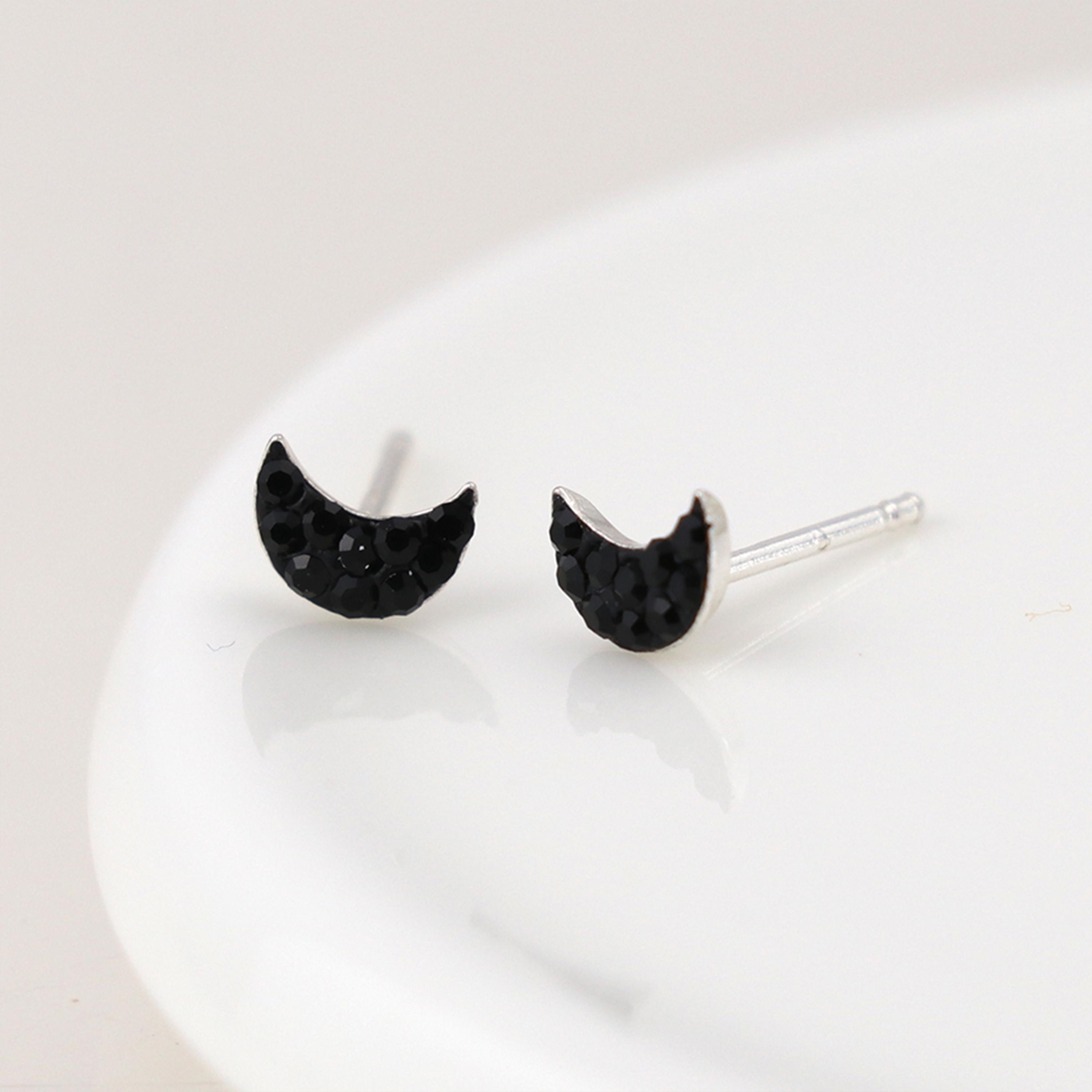 Crafted from solid 925 sterling silver and set with tiny black crystals, these dainty crescent studs measure 5mm across — perfect for everyday wear or a hint of nighttime glamour. Lightweight and comfortable, they make an ideal gift for stargazers, moon lovers, or anyone who loves a touch of celestial magic.