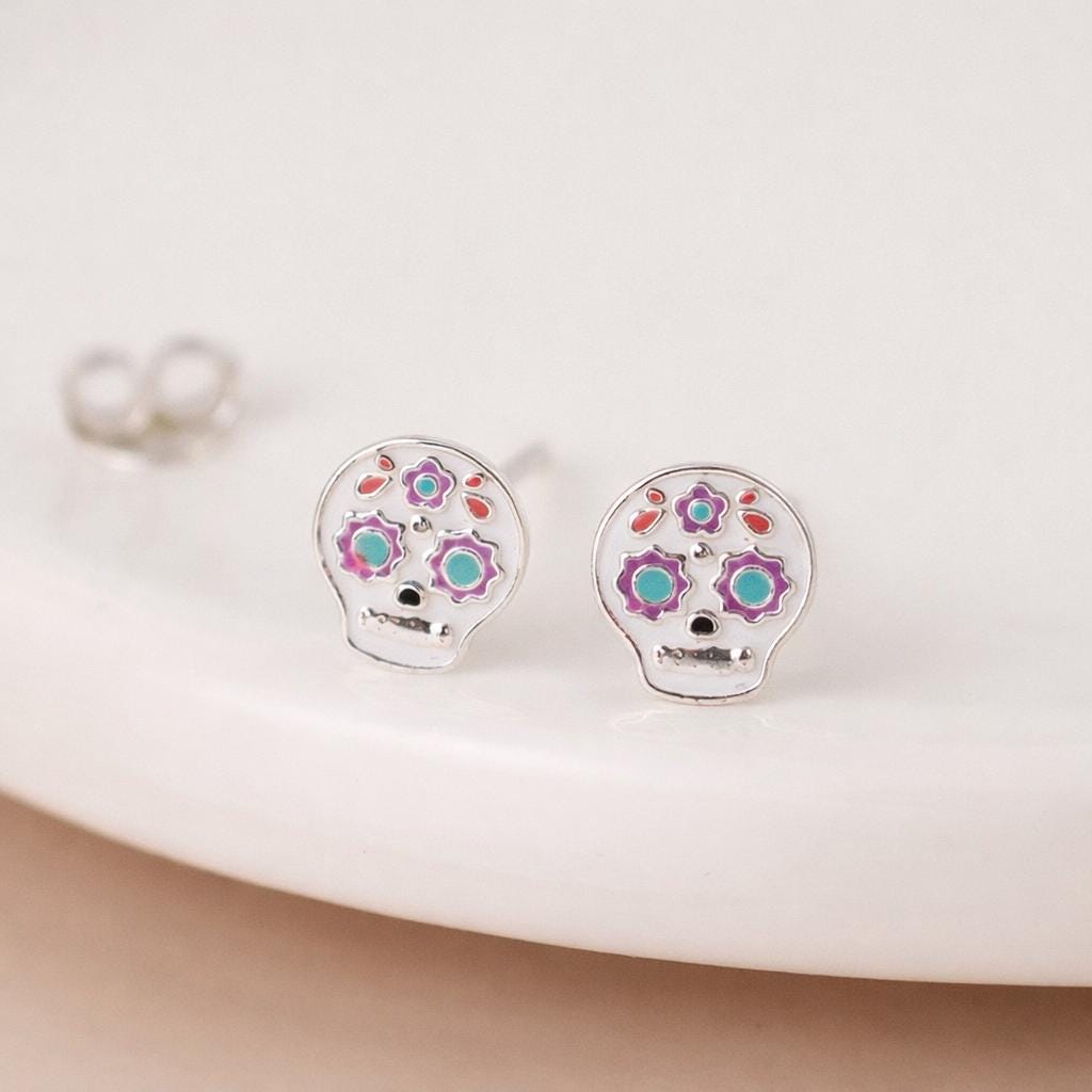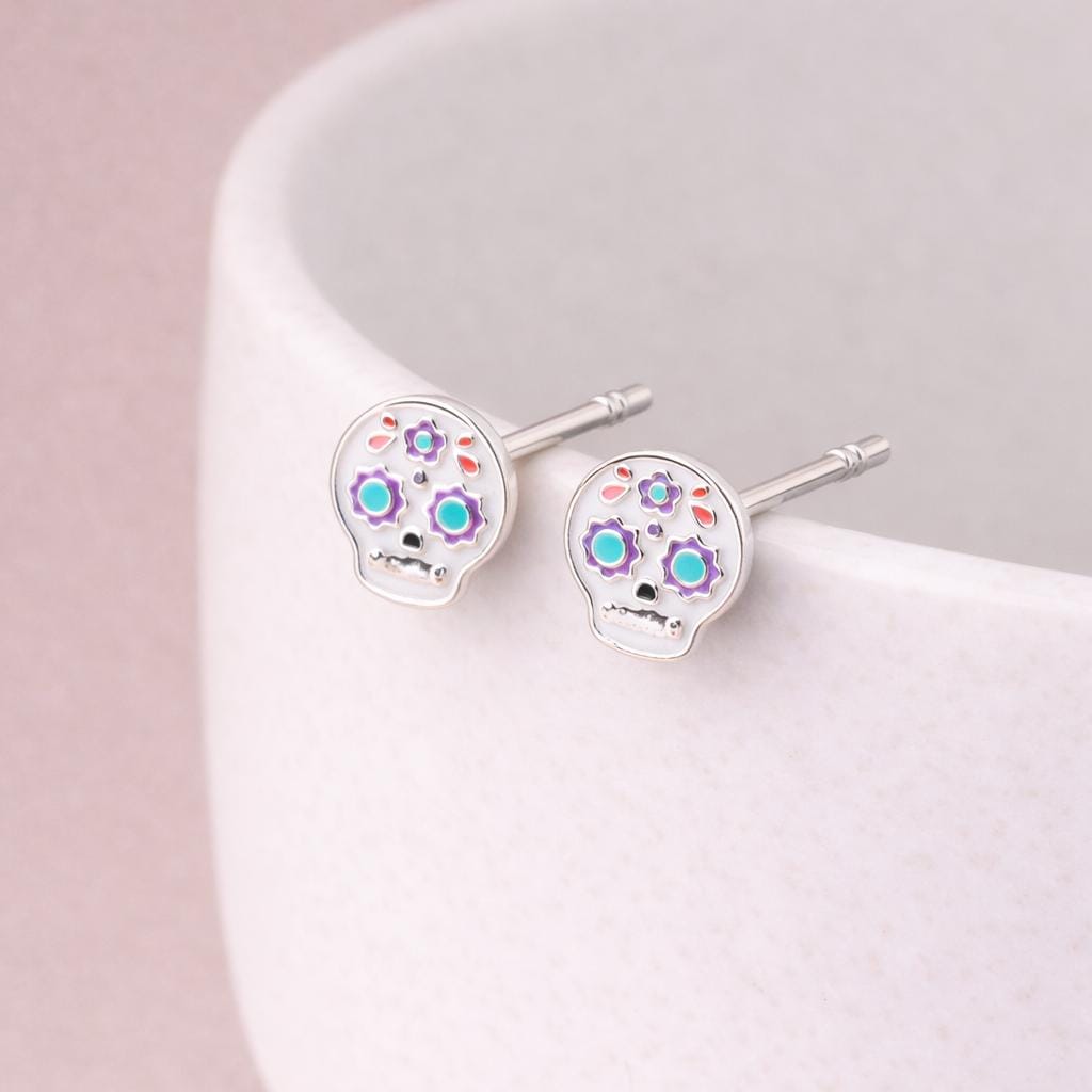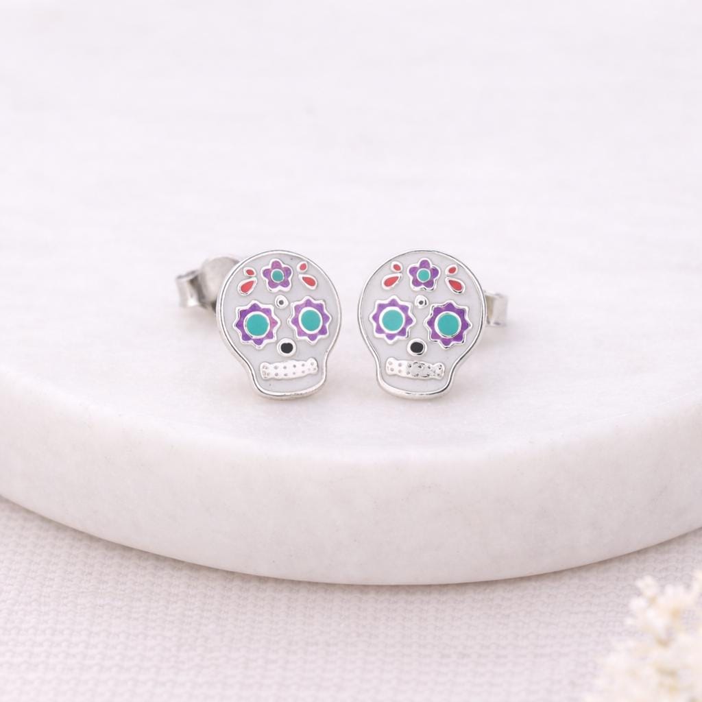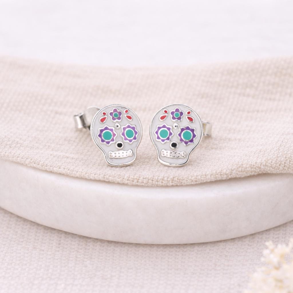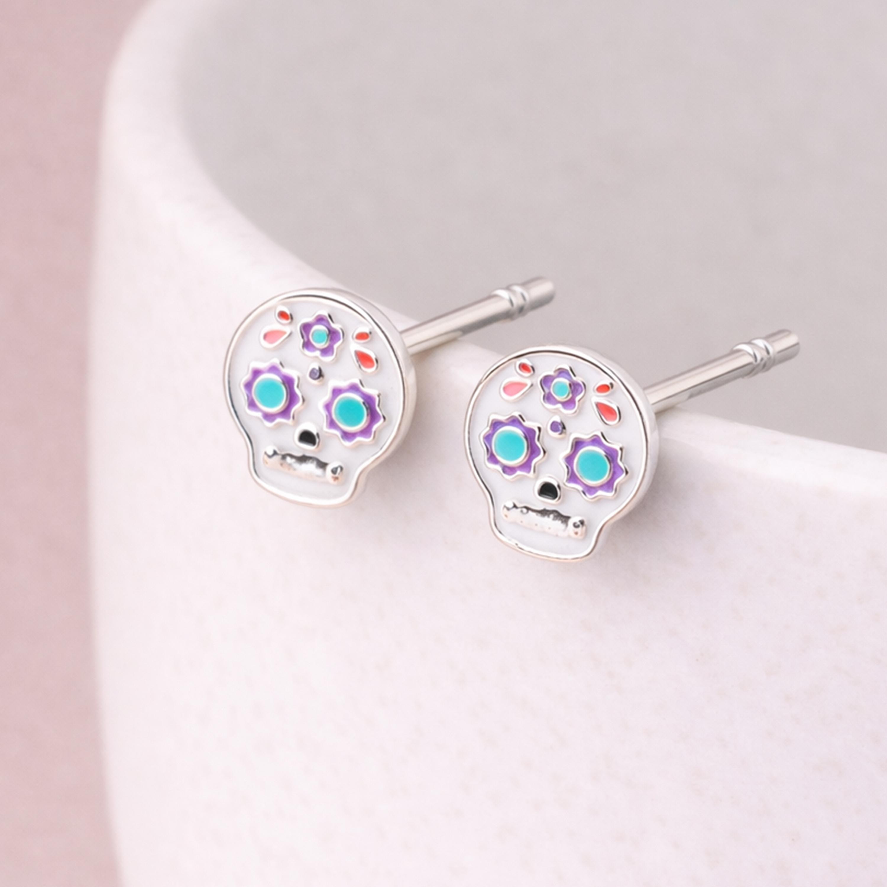 These sugar skull stud earrings are crafted from solid 925 sterling silver and finished with detailed hand-applied enamel, inspired by traditional Day of the Dead skull designs. Nickel free and hypoallergenic, they are gentle on sensitive ears and comfortable for everyday wear.