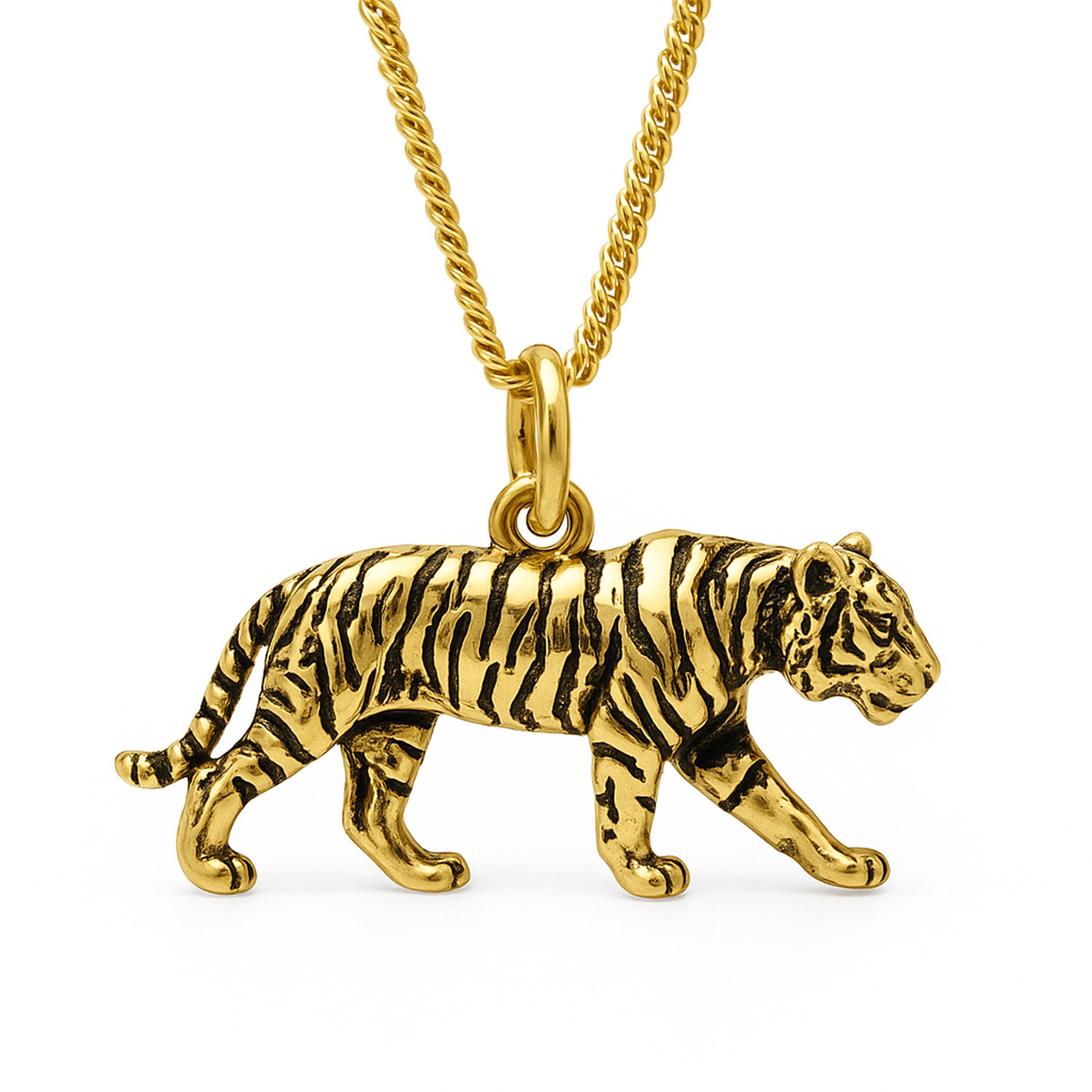This striking tiger pendant is crafted from solid 925 sterling silver and plated in 0.50 micron of 18ct yellow gold. With its powerful stance and beautifully detailed stripes, this pendant embodies strength, confidence, and grace.