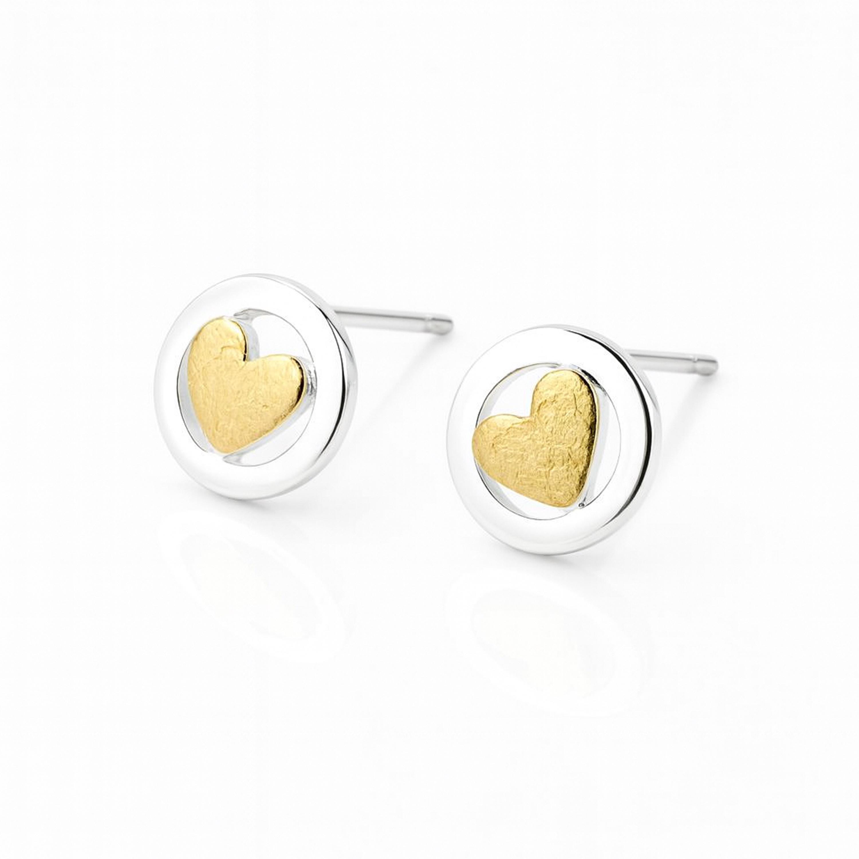 Sterling silver circle studs with a textured gold heart centre — timeless, two-tone design perfect for everyday wear or gifting.