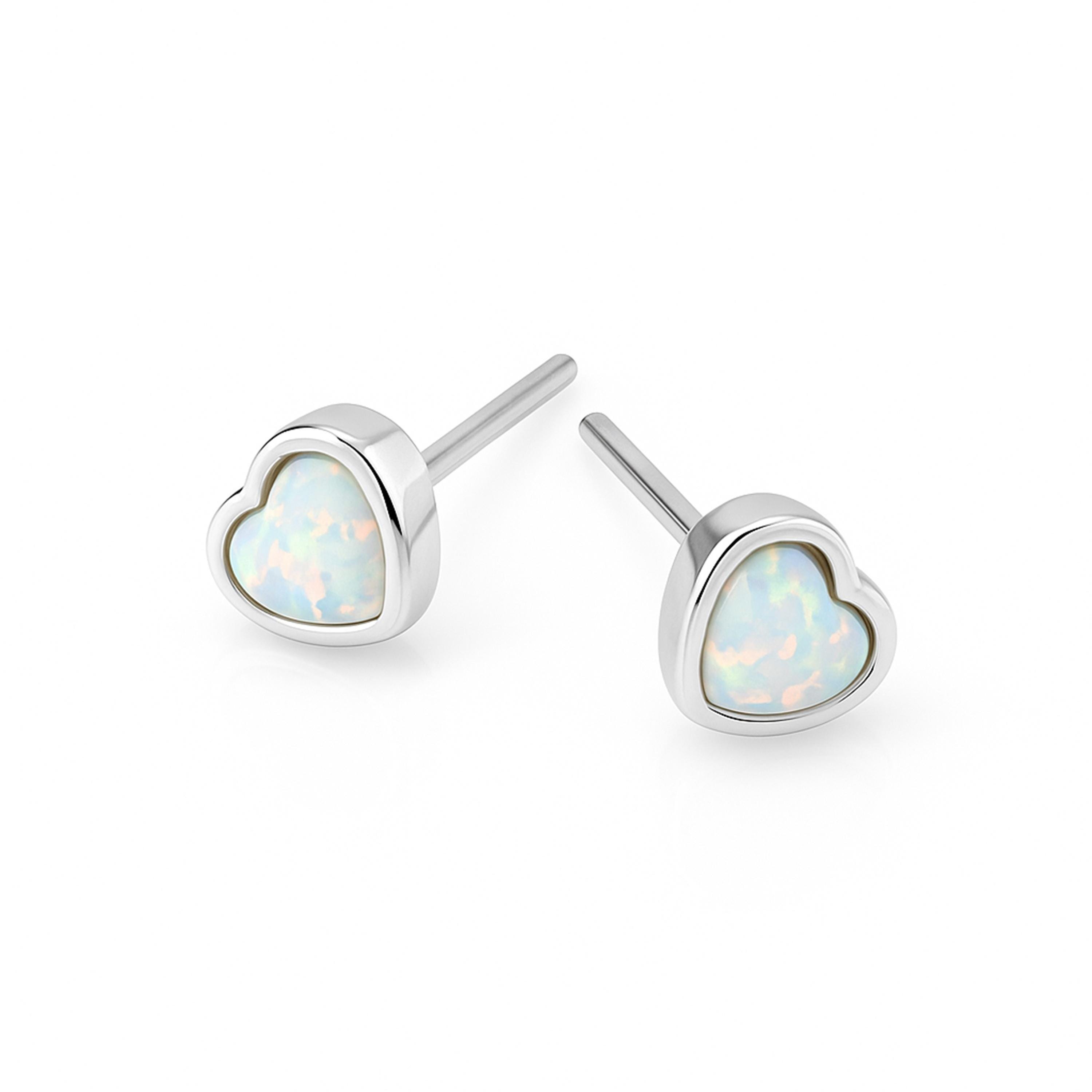 Sterling silver heart studs with lab-created white opal — a delicate, sparkling design perfect for everyday wear or gifting.
