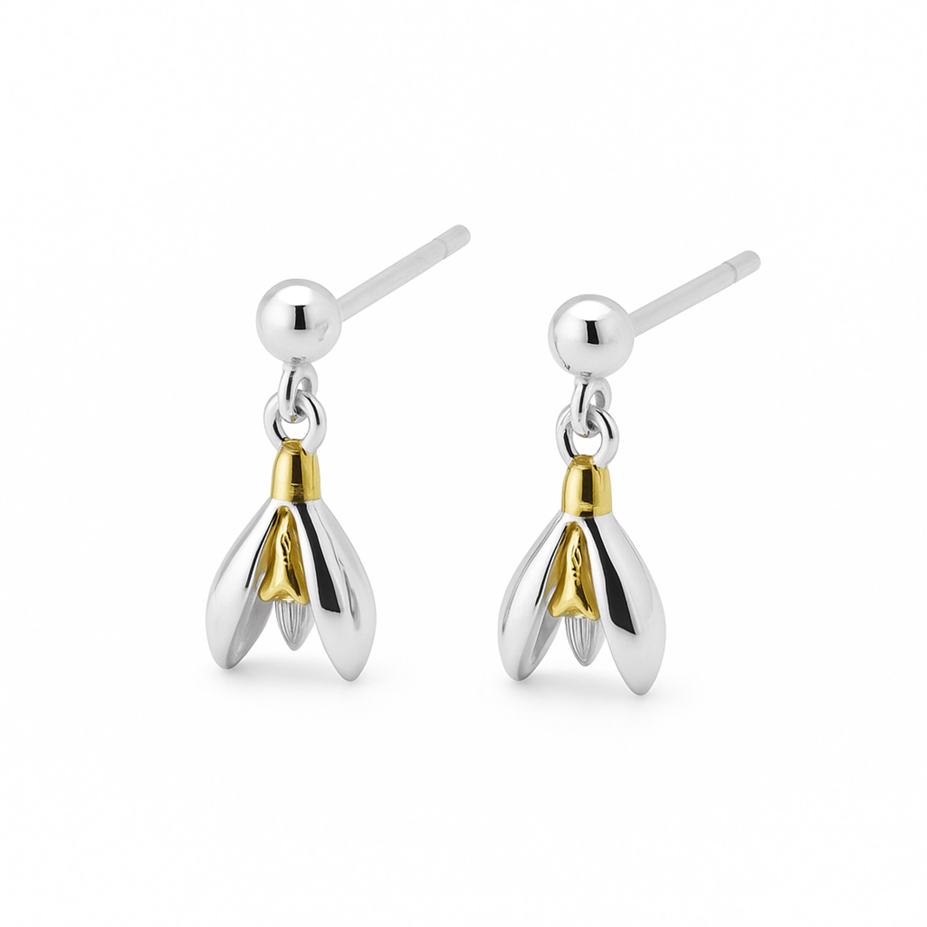 Sterling silver snowdrop drop earrings with 18ct gold-plated accents — a delicate birth flower design perfect for everyday wear or gifting.