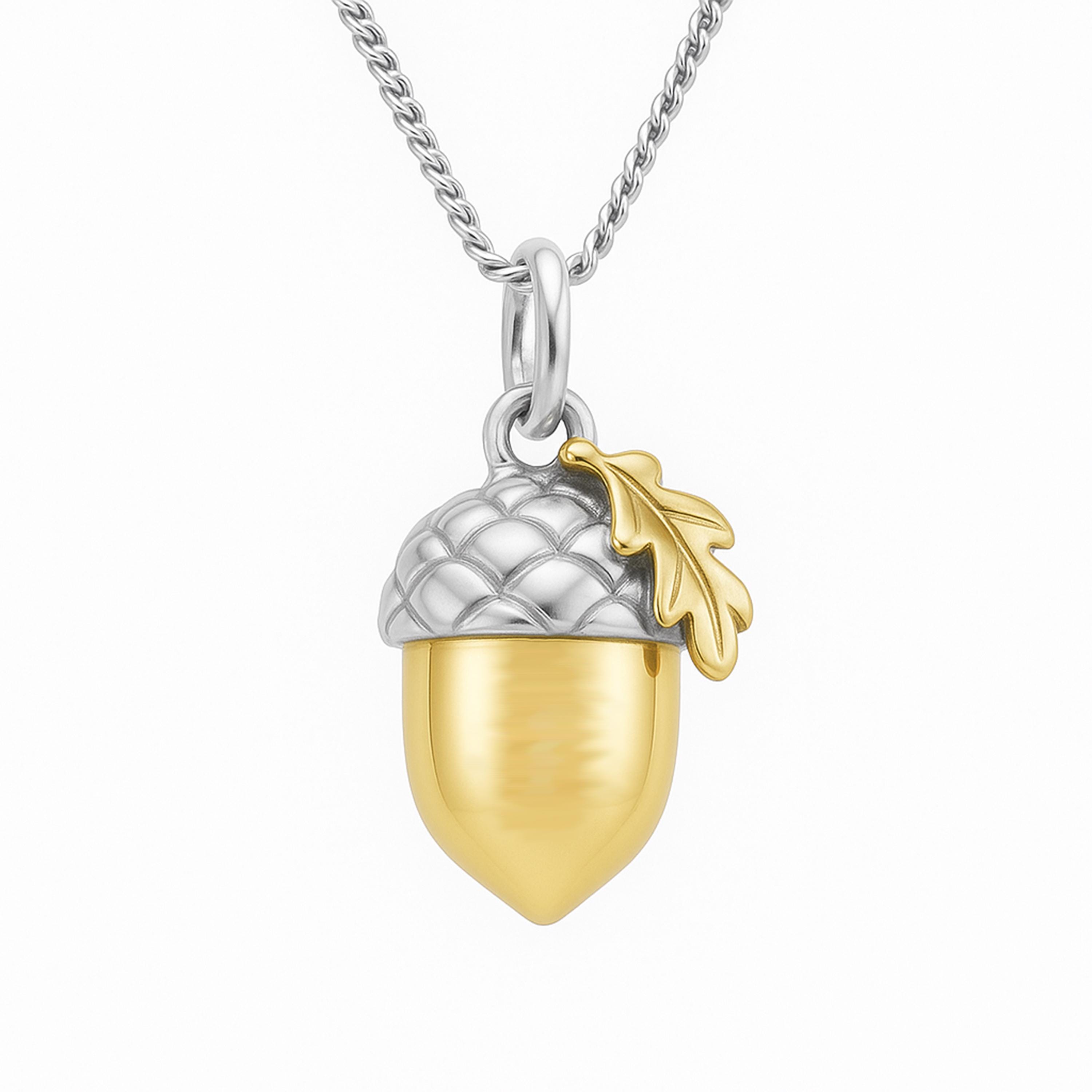 A symbolic acorn pendant in silver and gold – personalise to create a meaningful gift of growth, luck and new beginnings.