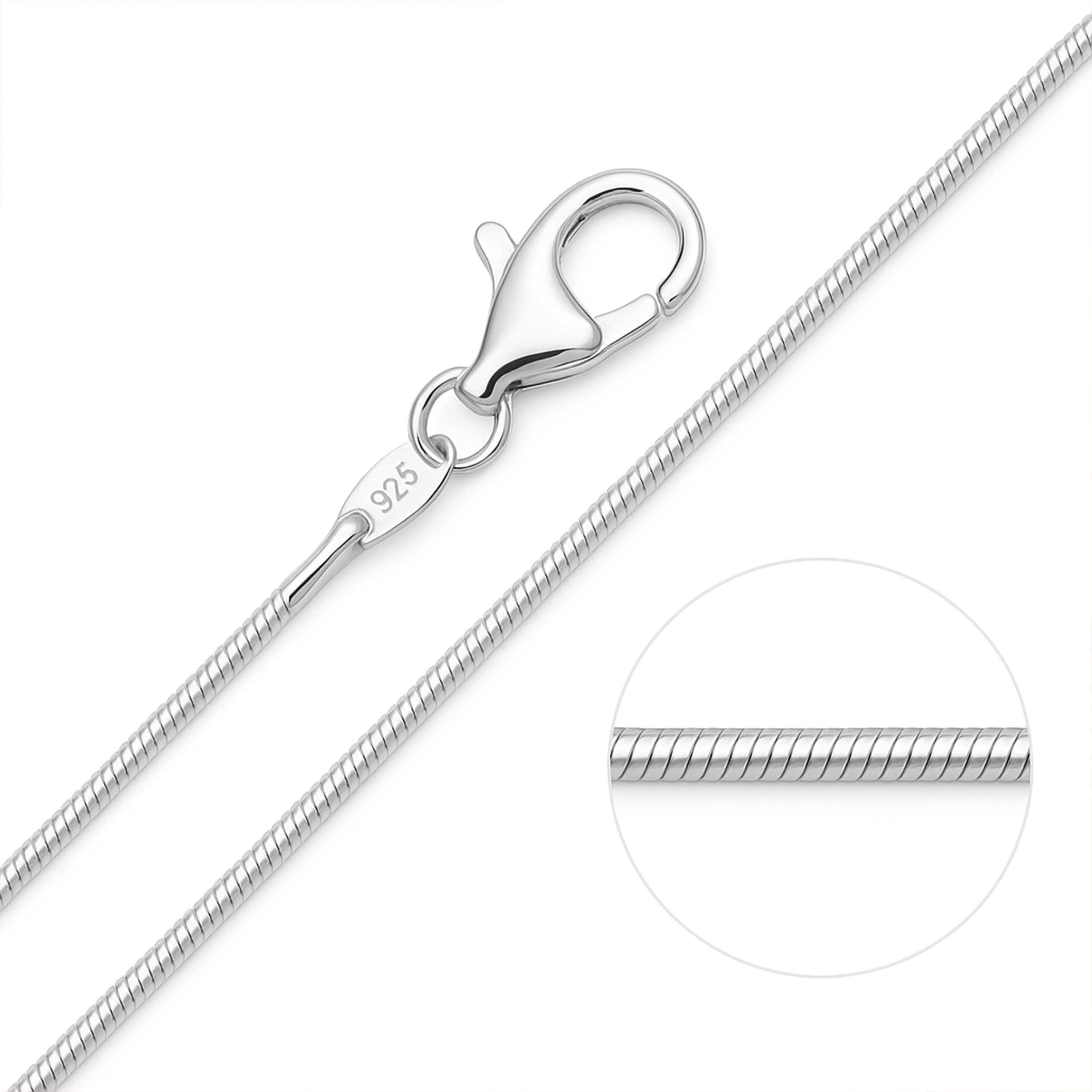 Crafted from 925 sterling silver, this polished chain has a smooth, rounded snake style that sits comfortably on the skin and catches the light beautifully. At 1mm wide, it’s fine yet durable, secured with a trigger clasp for extra strength. Available in lengths from 16in to 28in, it’s a versatile choice for both minimalist looks and statement pendants.
