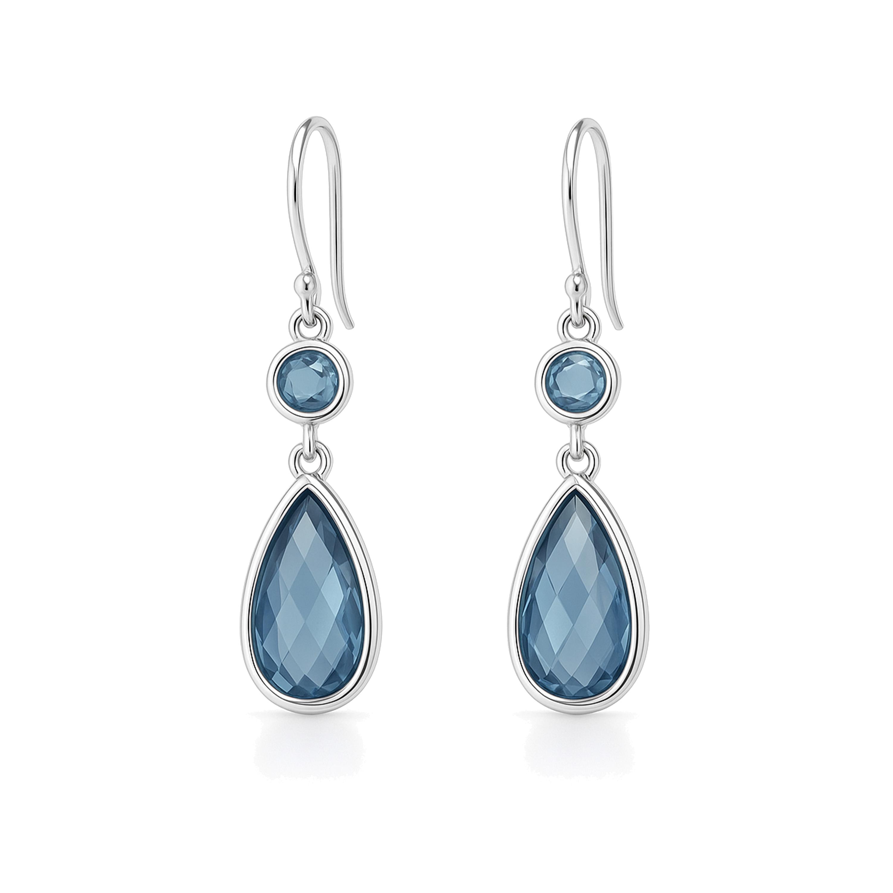 Handmade from solid 925 sterling silver, each earring features a round-cut blue cubic zirconia above a larger faceted teardrop stone, both set in polished silver. Measuring 33mm high by 12mm wide and weighing approx. 4.20g, they strike the perfect balance between statement and lightweight comfort. A gorgeous gift for birthdays, anniversaries, bridesmaids, or anyone who loves elegant gemstone jewellery.