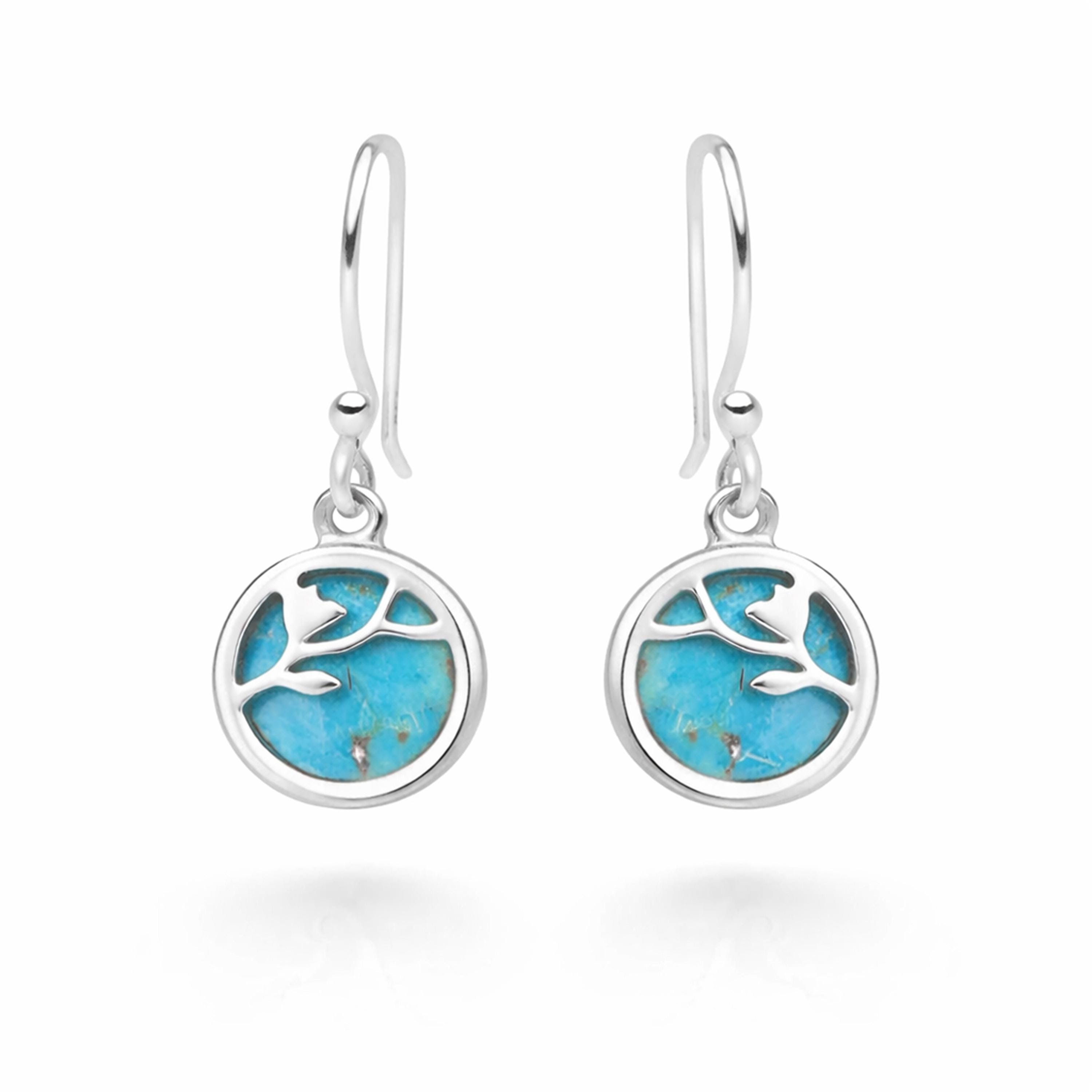 Each pair showcases a round turquoise charm with a fine cut-out flower motif layered over the stone. The turquoise adds a soft pop of colour, while the polished silver frame keeps the look clean and timeless. Lightweight and comfortable, they offer gentle movement when worn.