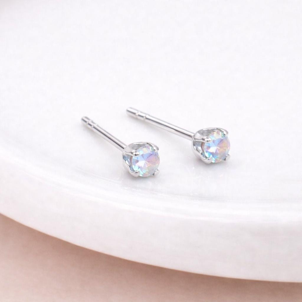 These opal coloured stud earrings are crafted from solid 925 sterling silver and set with a luminous opal coloured cubic zirconia, designed to reflect the soft, iridescent look of opal in a delicate, everyday style. Nickel-free and hypoallergenic, they are gentle on sensitive ears and comfortable to wear all day.