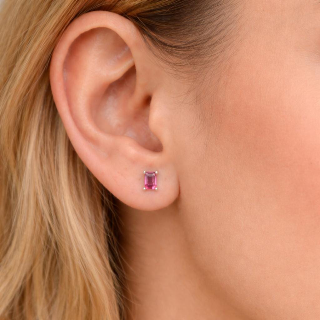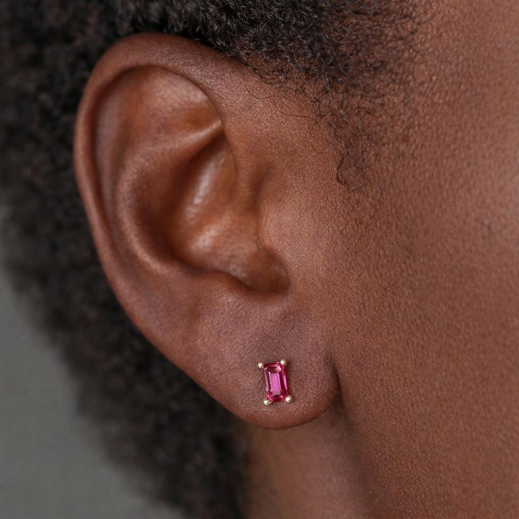 These pink ruby baguette stud earrings are crafted from solid 925 sterling silver and set with a deep pink ruby coloured cubic zirconia, offering a sleek, modern take on a classic gemstone style. Nickel-free and hypoallergenic, they are gentle on sensitive ears and comfortable for everyday wear.
