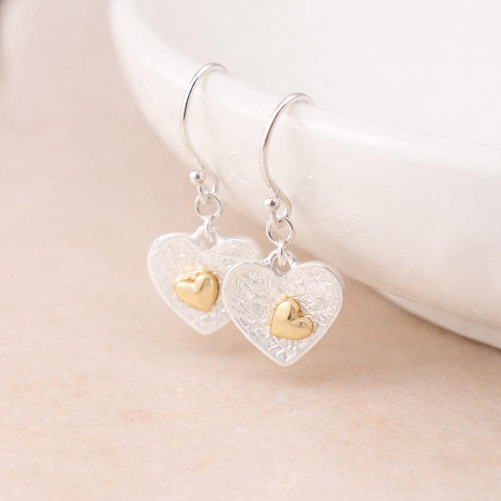 These two tone heart drop earrings are crafted from brass with sterling silver plating and gold plating, creating a delicate silver and gold finish with subtle contrast. Each earring features a textured silver heart with a raised polished gold heart at its centre, suspended from a fine hook wire for gentle movement.