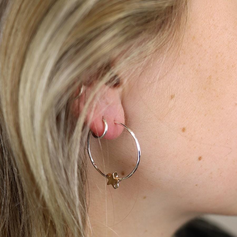 Perfect as silver and gold star hoop earrings, celestial inspired hoops, mixed metal everyday earrings, or thoughtful gift earrings for her, this design feels playful yet refined.