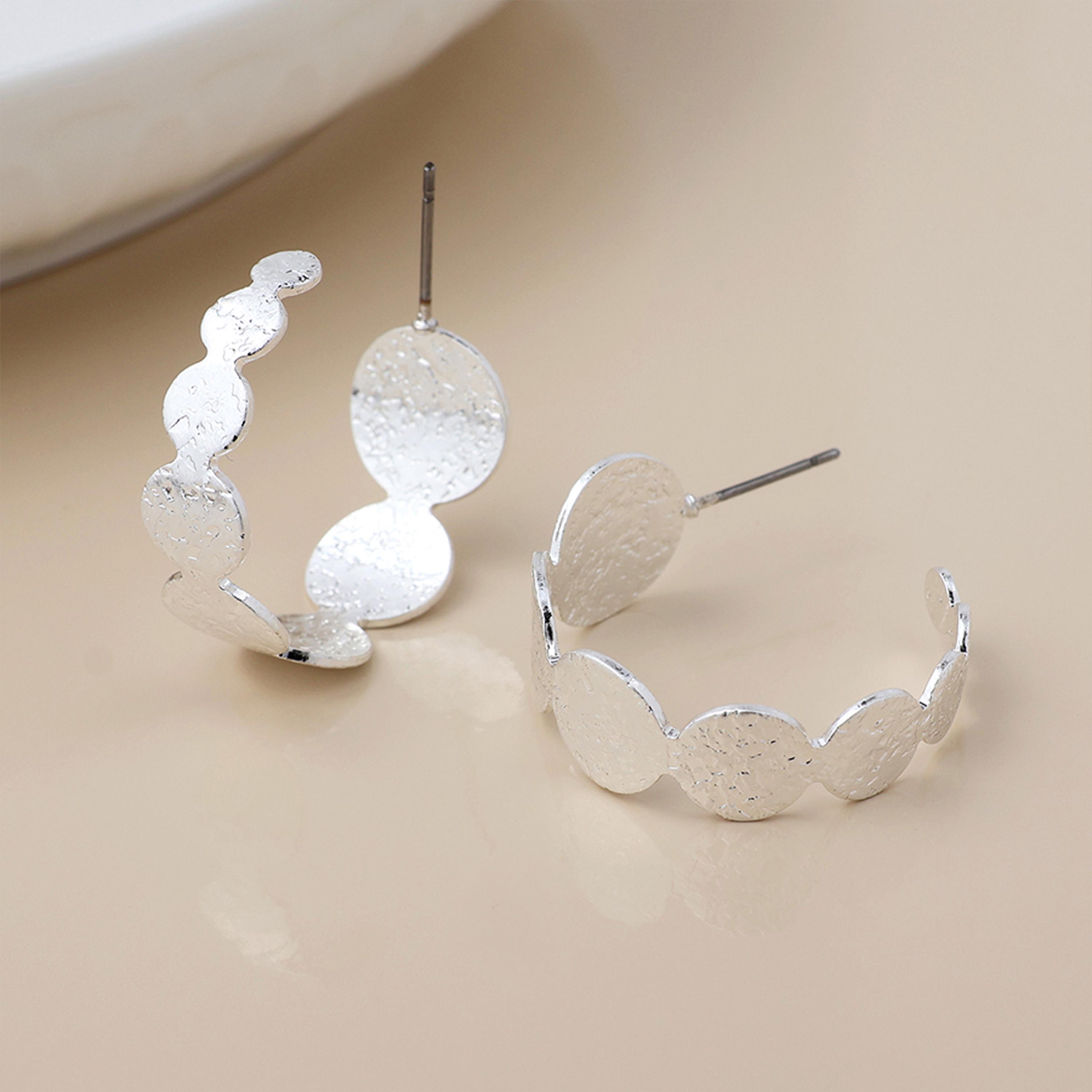 The front section features a series of softly hammered round discs, forming a gentle scalloped shape with a maximum width of approximately 14.00mm. The lightly textured surface catches the light in a subtle, matte shimmer rather than a high polish shine, adding depth and dimension. At around 2.60g, they have a noticeable presence while remaining comfortable for everyday wear.