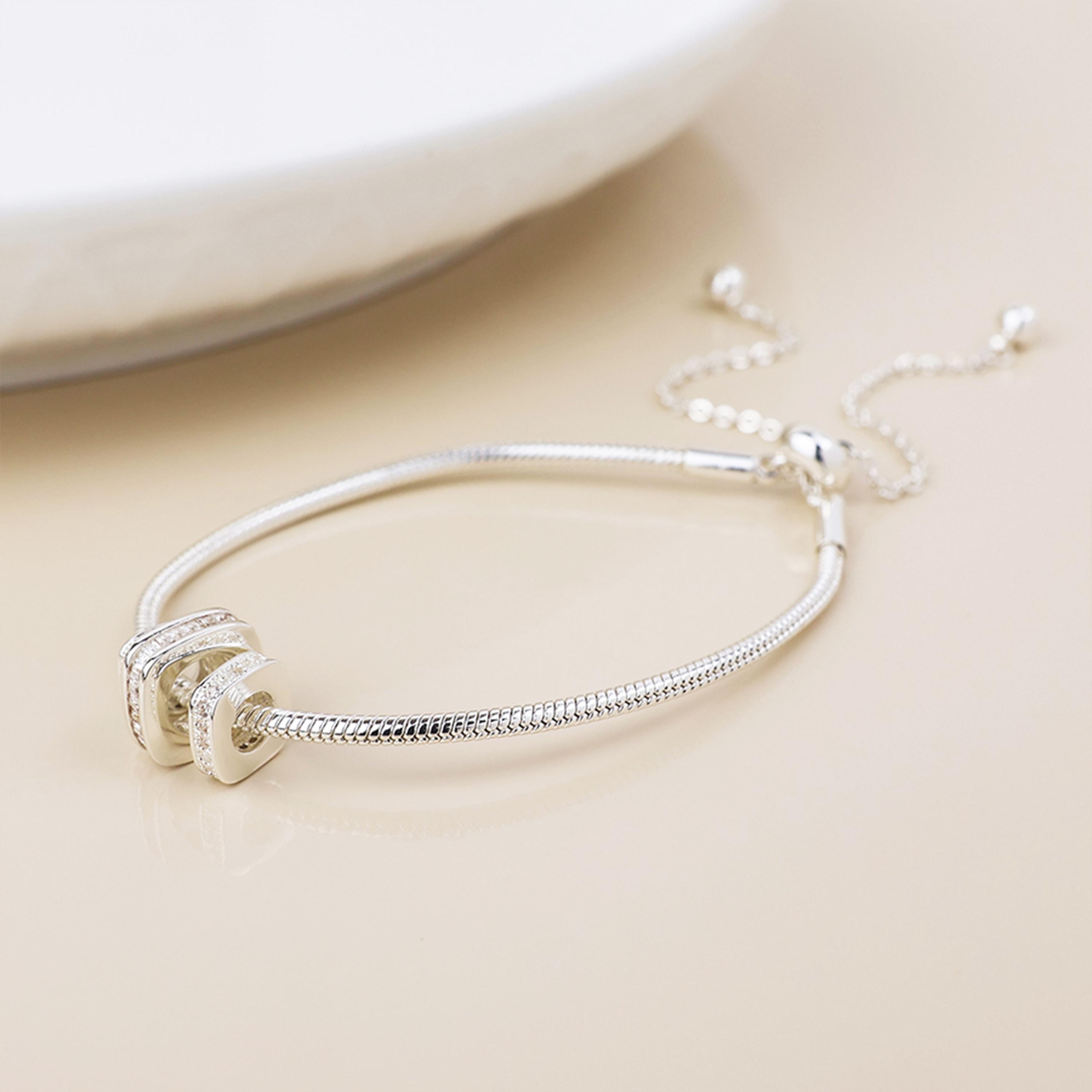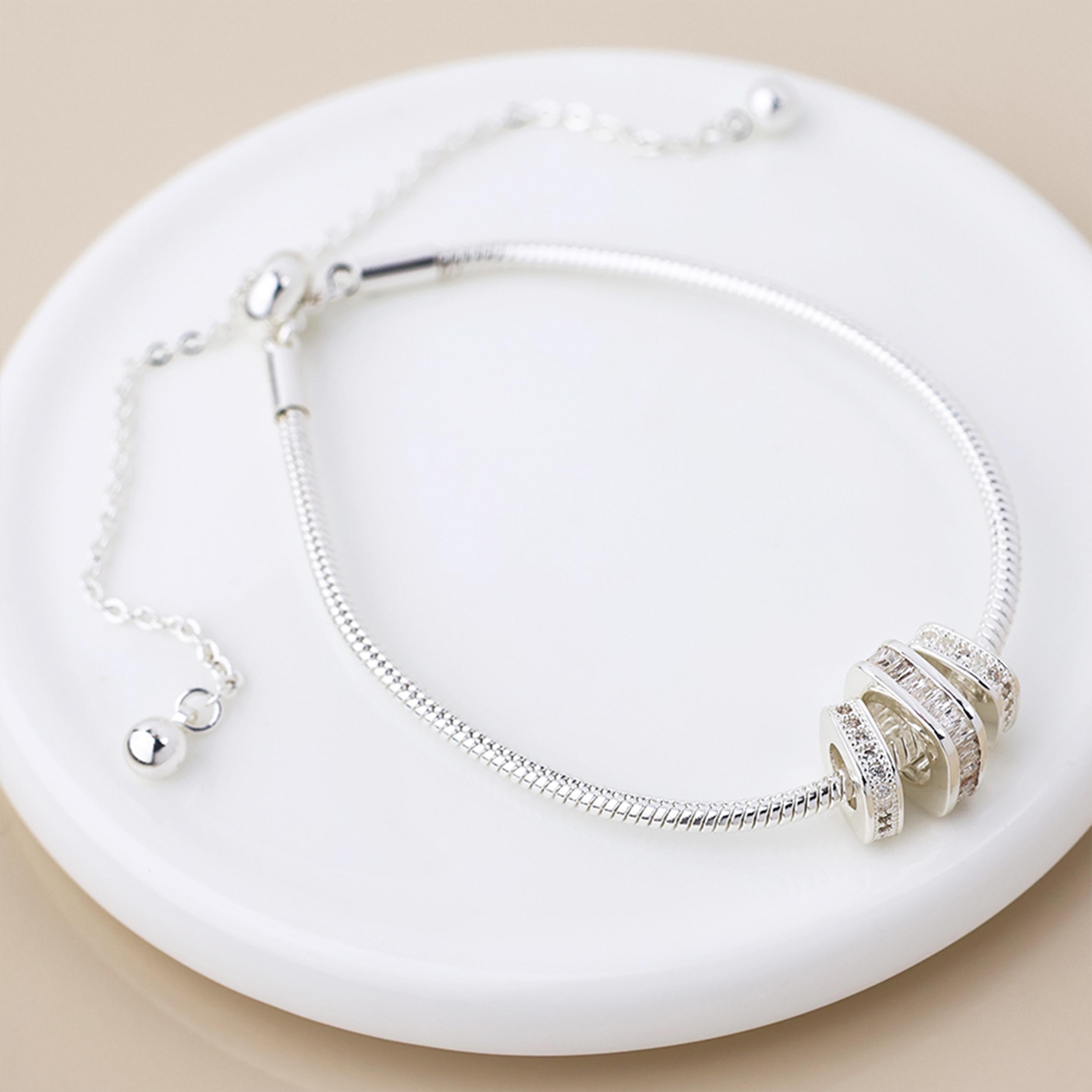 Perfect as a silver crystal bracelet, adjustable slider bracelet, modern charm bracelet, or elegant everyday wristwear for her, this design transitions beautifully from day to evening.