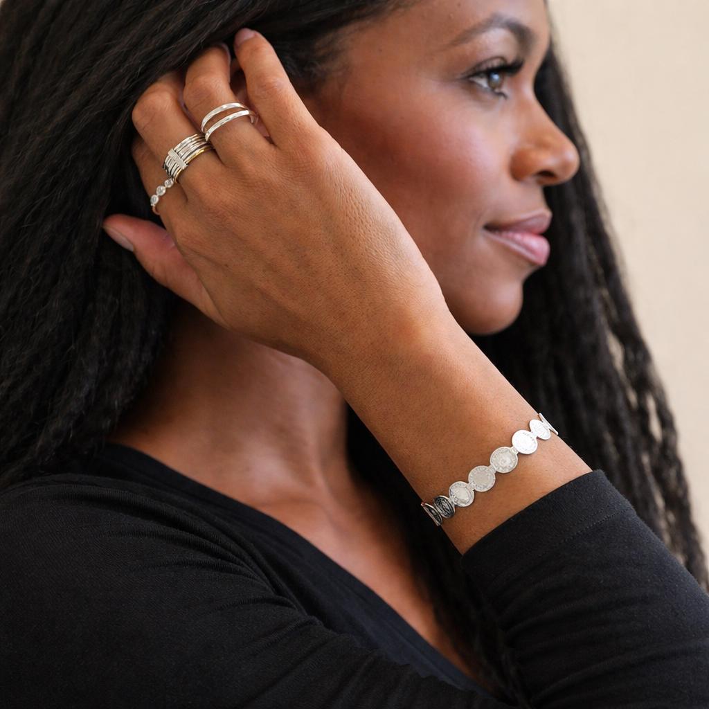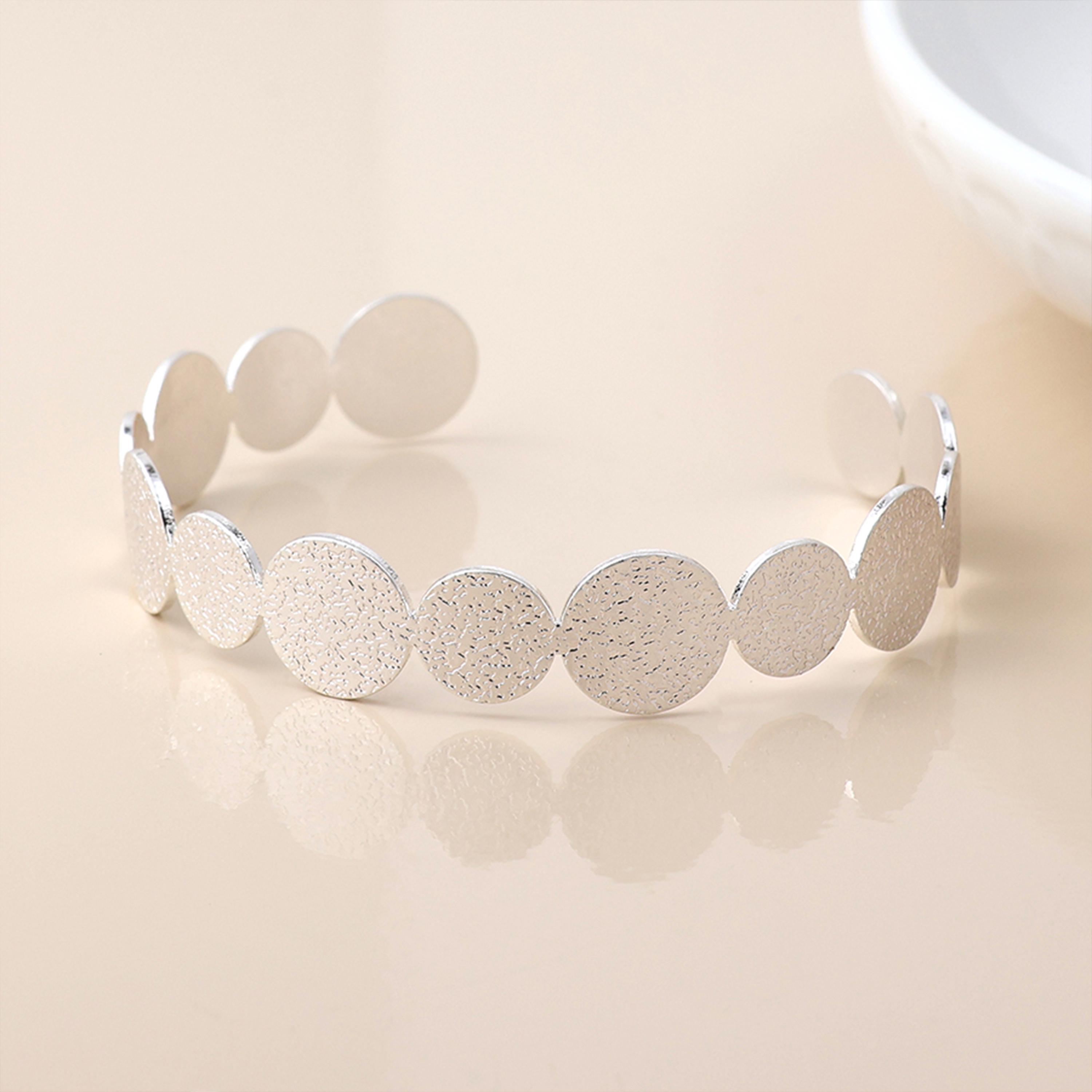 This textured disc cuff bracelet is crafted from brass with sterling silver plating and finished in a bright silver tone. Designed with a row of softly hammered circular discs, it creates a contemporary, sculptural silhouette that wraps comfortably around the wrist.