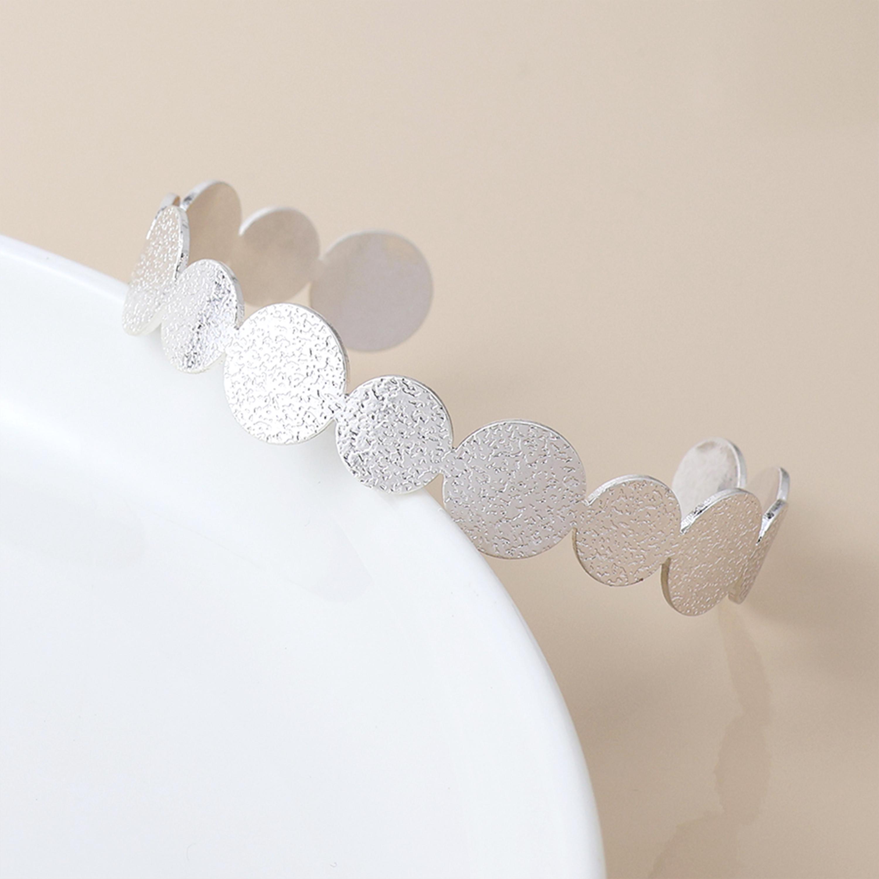 Perfect as a silver cuff bracelet, textured disc bangle, modern statement bracelet, or everyday silver wristwear for her, this design blends simplicity with artistic detail.