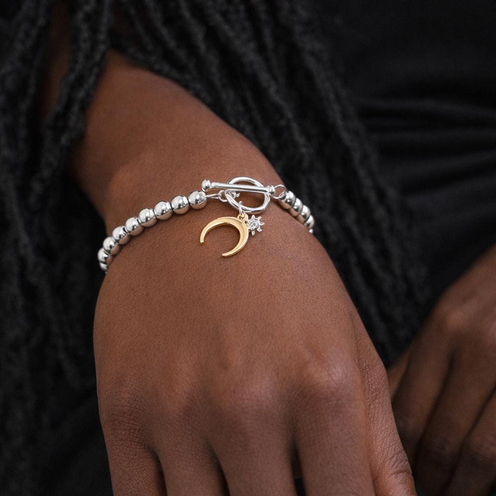 The bracelet features evenly spaced high shine silver beads that reflect the light beautifully across the wrist. At the fastening, a circular toggle clasp secures the bracelet while also becoming part of the design. Suspended from the toggle is a crescent moon charm in a warm gold tone, paired with a delicate crystal set star for added sparkle and contrast.