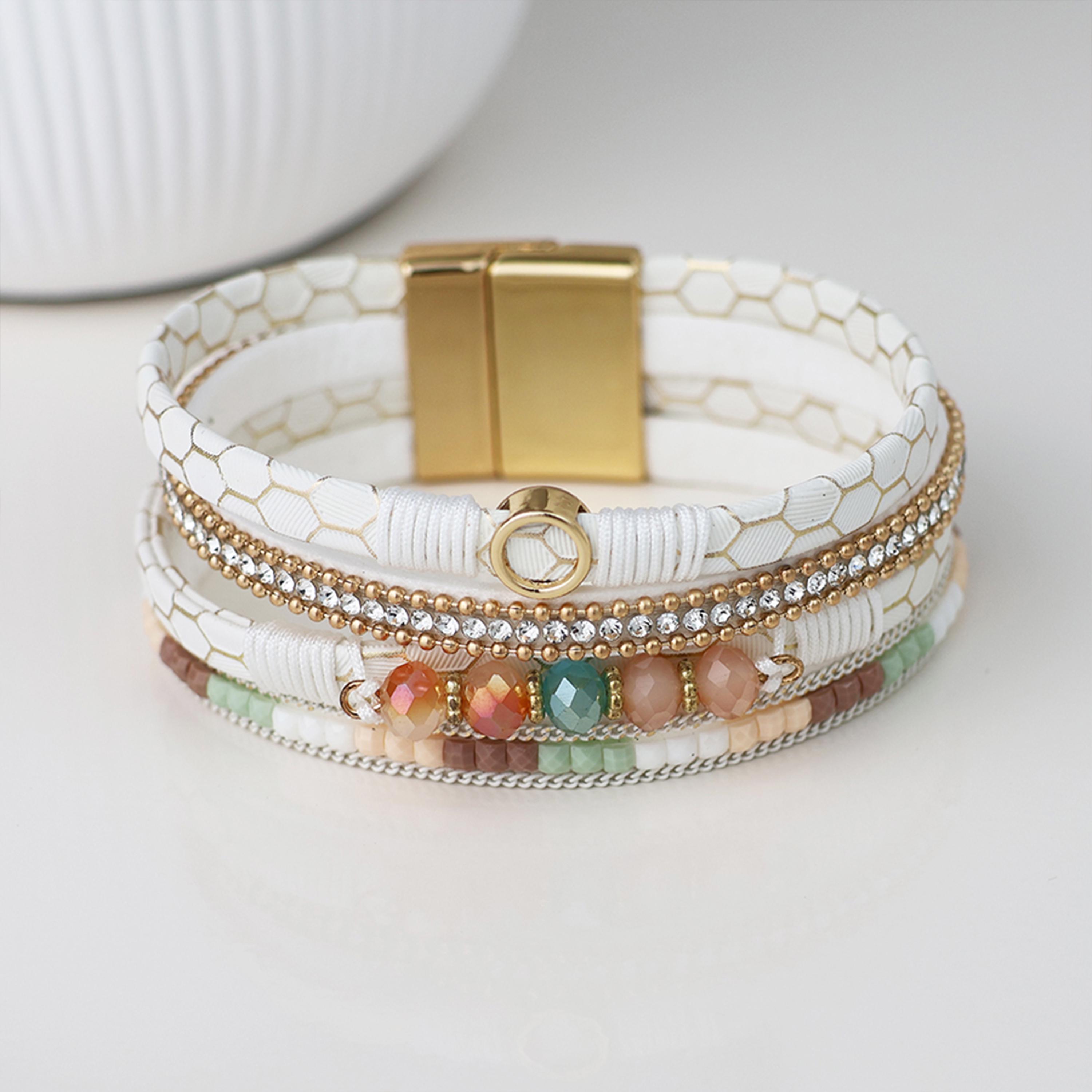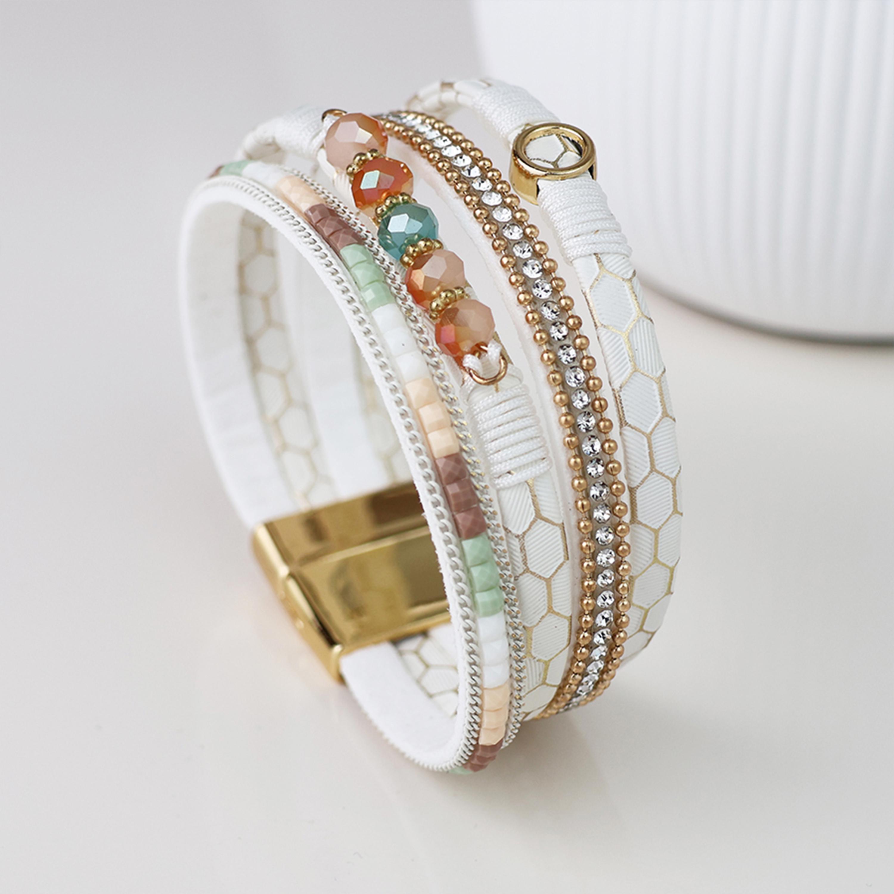 This white and gold multi strand leather bracelet is crafted from brass with gold plating, genuine leather, and sparkling crystals. Designed with layered strands in soft neutral and pastel tones, it creates a bold stacked look in one easy to wear piece.