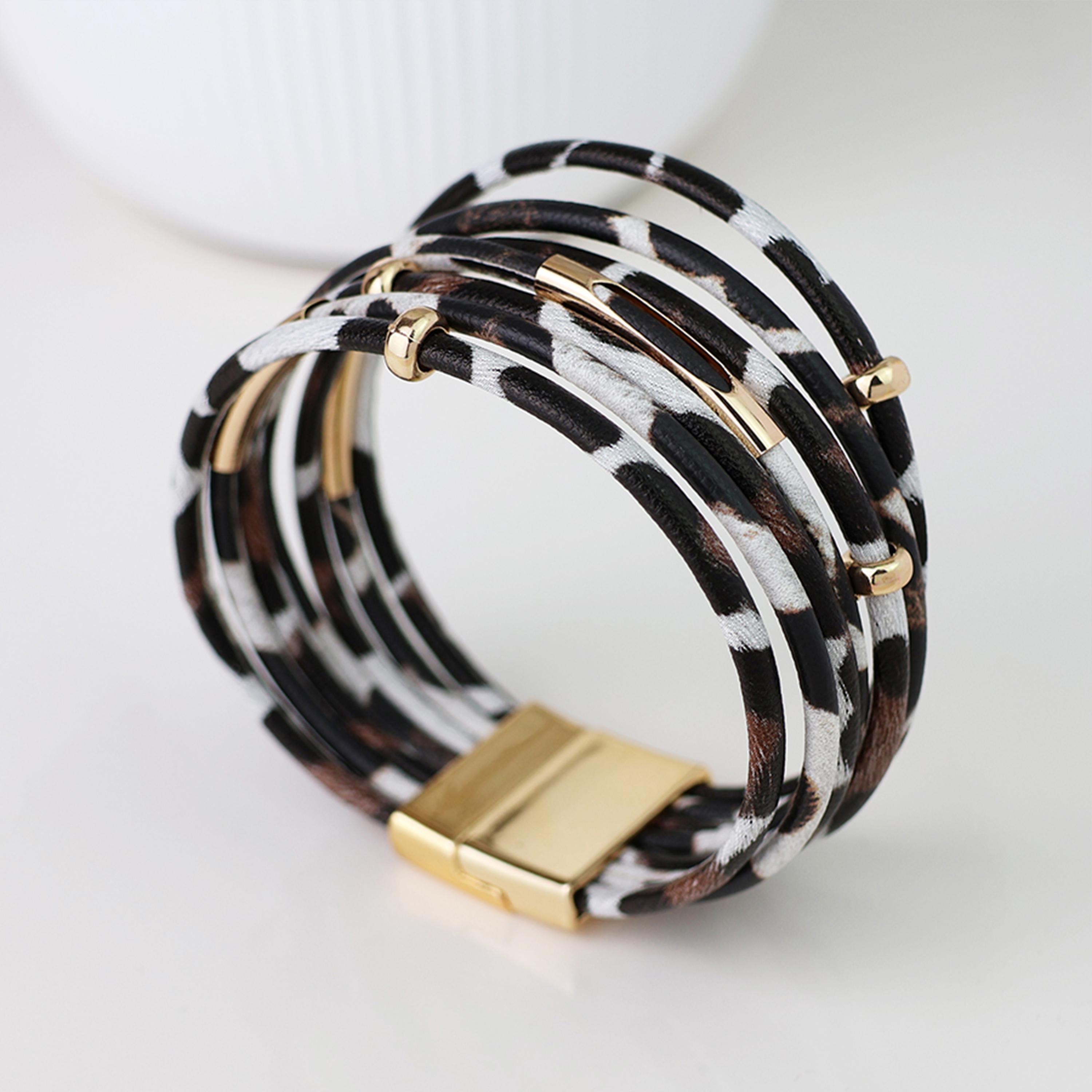 The bracelet is made up of multiple slim faux leather strands in an eye catching animal print design, accented with smooth gold tone bars and spacers for contrast and structure. The combination of curved lines and metallic elements adds dimension and movement across the wrist.