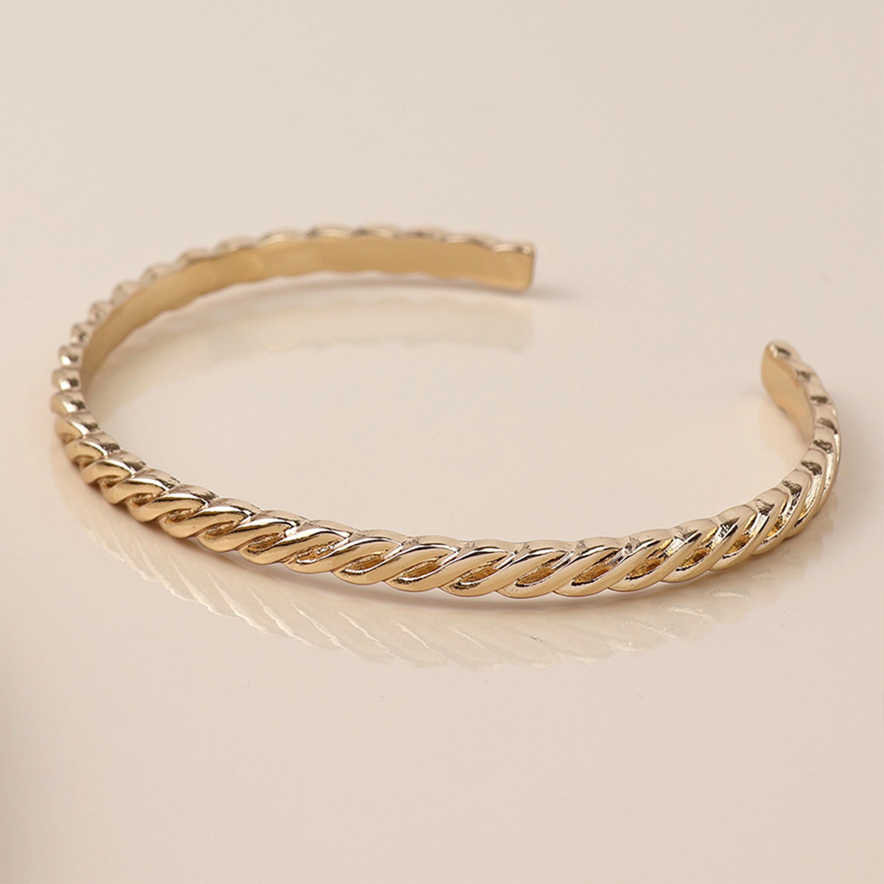 This twisted gold cuff bracelet is crafted from brass with gold plating and finished in a warm polished gold tone. Designed with a delicate rope twist pattern, it offers a refined, everyday look with subtle texture.