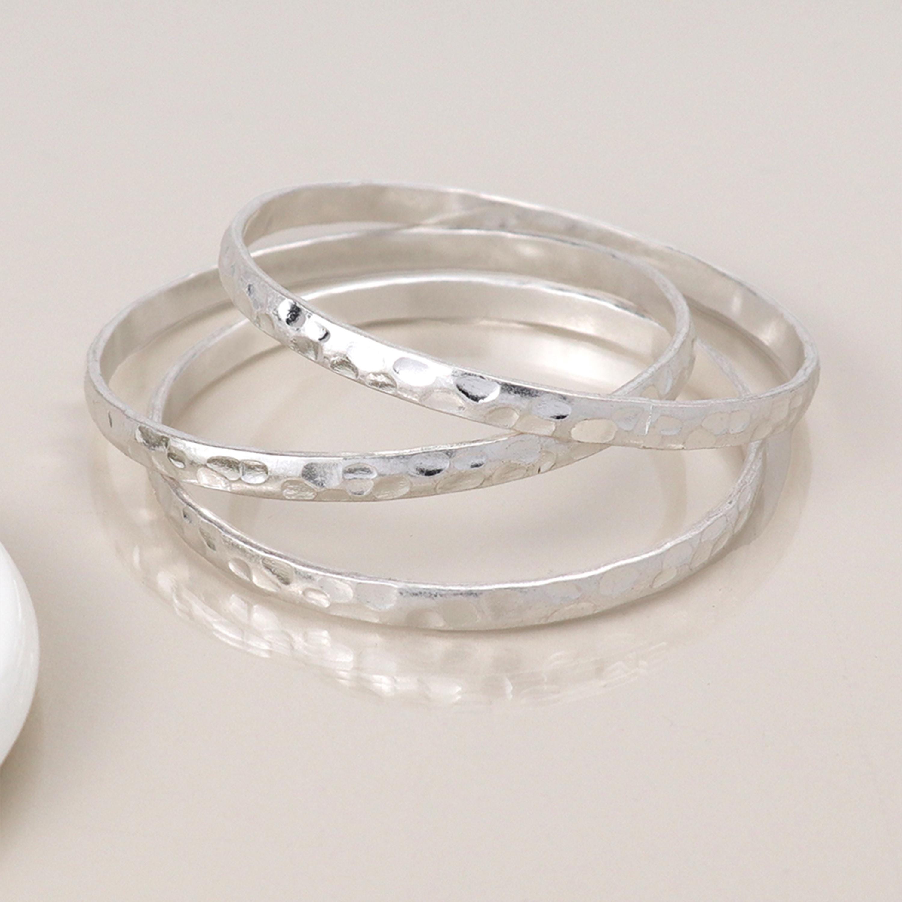 Perfect as silver stacking bangles, hammered silver bracelets, textured everyday wristwear, or a versatile three piece bangle set, this trio works effortlessly from casual daywear to evening styling.