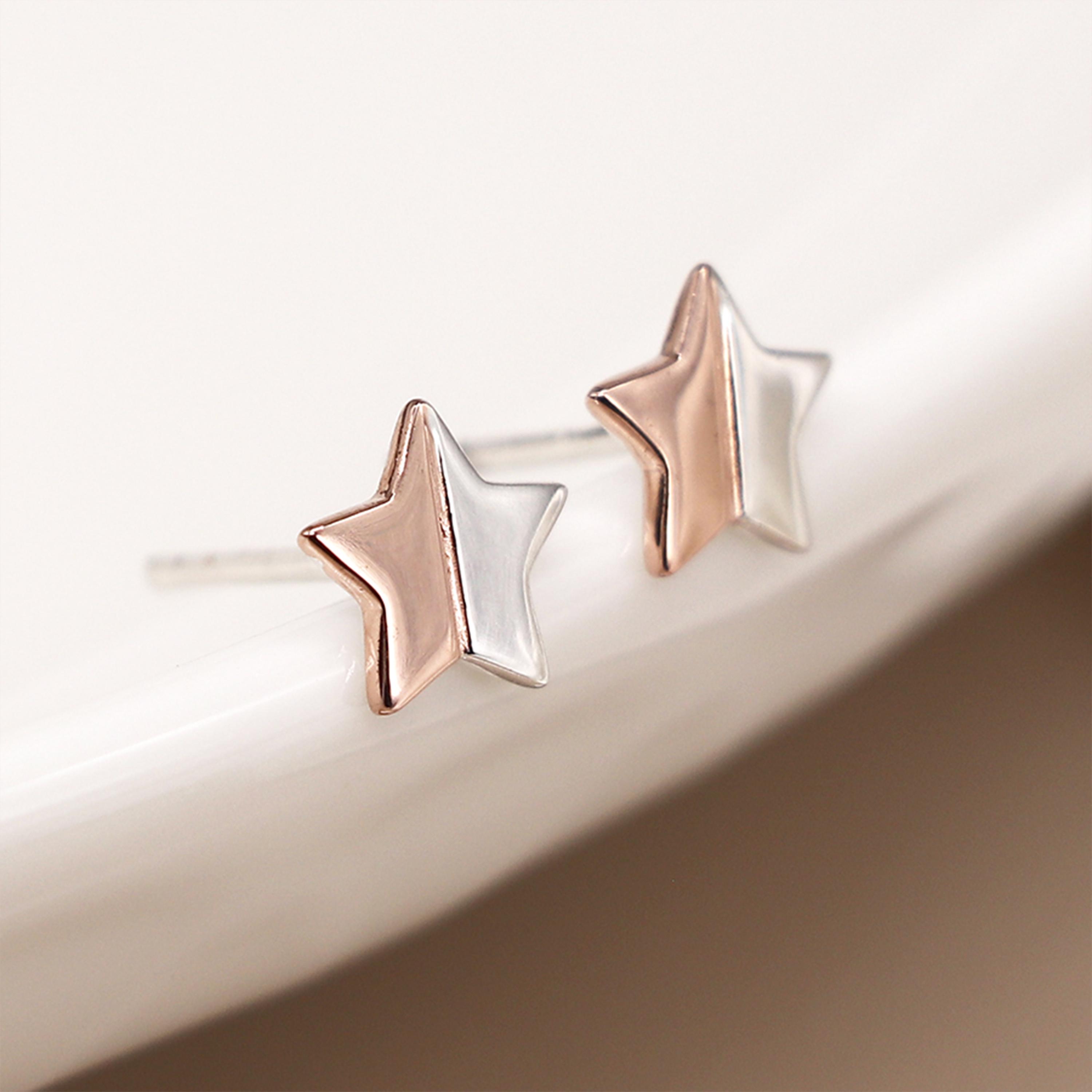 One half of each star is finished in bright sterling silver, while the other half is highlighted in soft 18ct rose gold plating, creating a beautiful mixed metal effect. The polished surface reflects the light gently, adding a delicate shimmer.