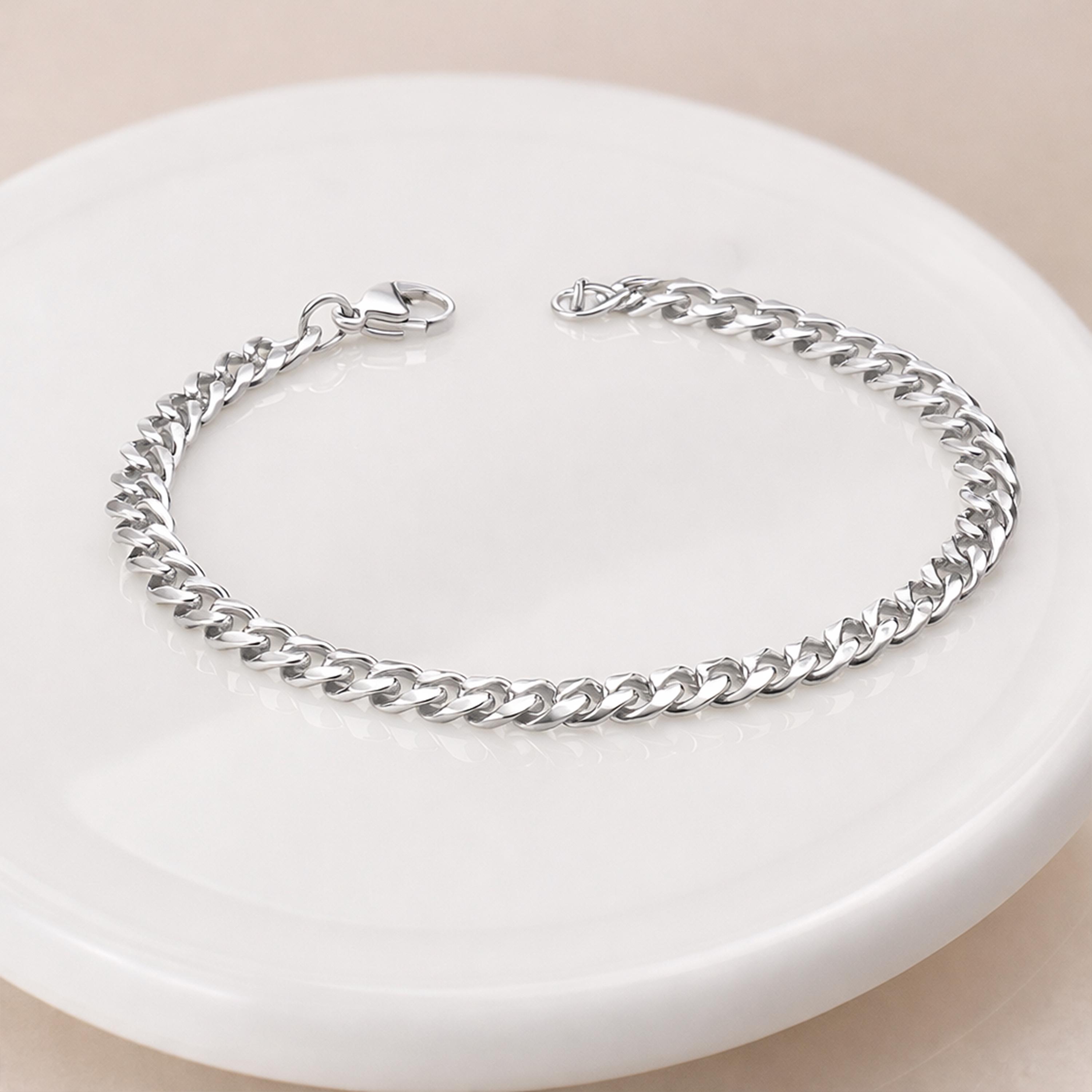 The smooth interlocking curb links lie comfortably against the skin and reflect the light beautifully, creating a clean, modern finish. Stainless steel is known for its strength and resistance to tarnishing, making this bracelet a low-maintenance and durable choice for daily wear.
