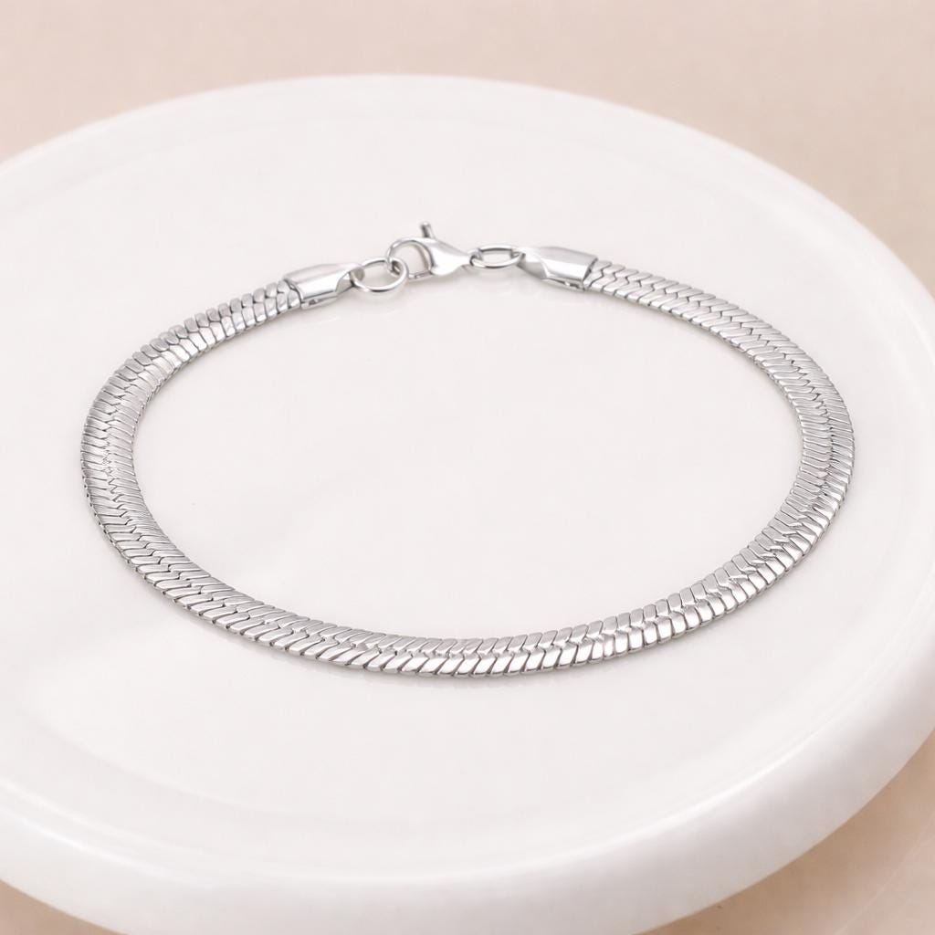 This flat herringbone bracelet is crafted from durable stainless steel and finished in a bright polished silver tone. Designed in a smooth, tightly woven herringbone pattern, it creates a sleek, continuous surface that reflects the light with a subtle shimmer.