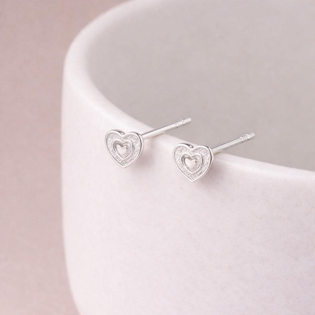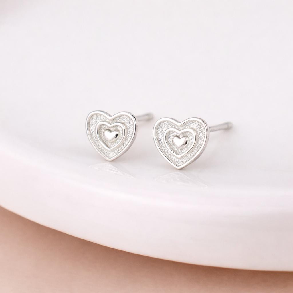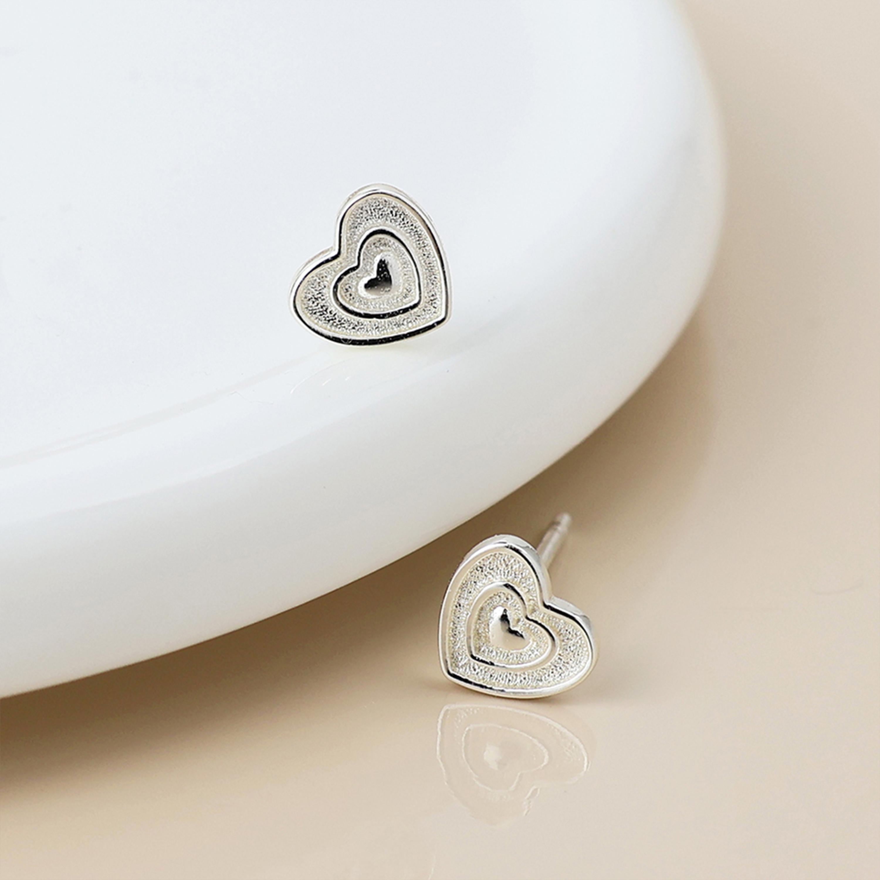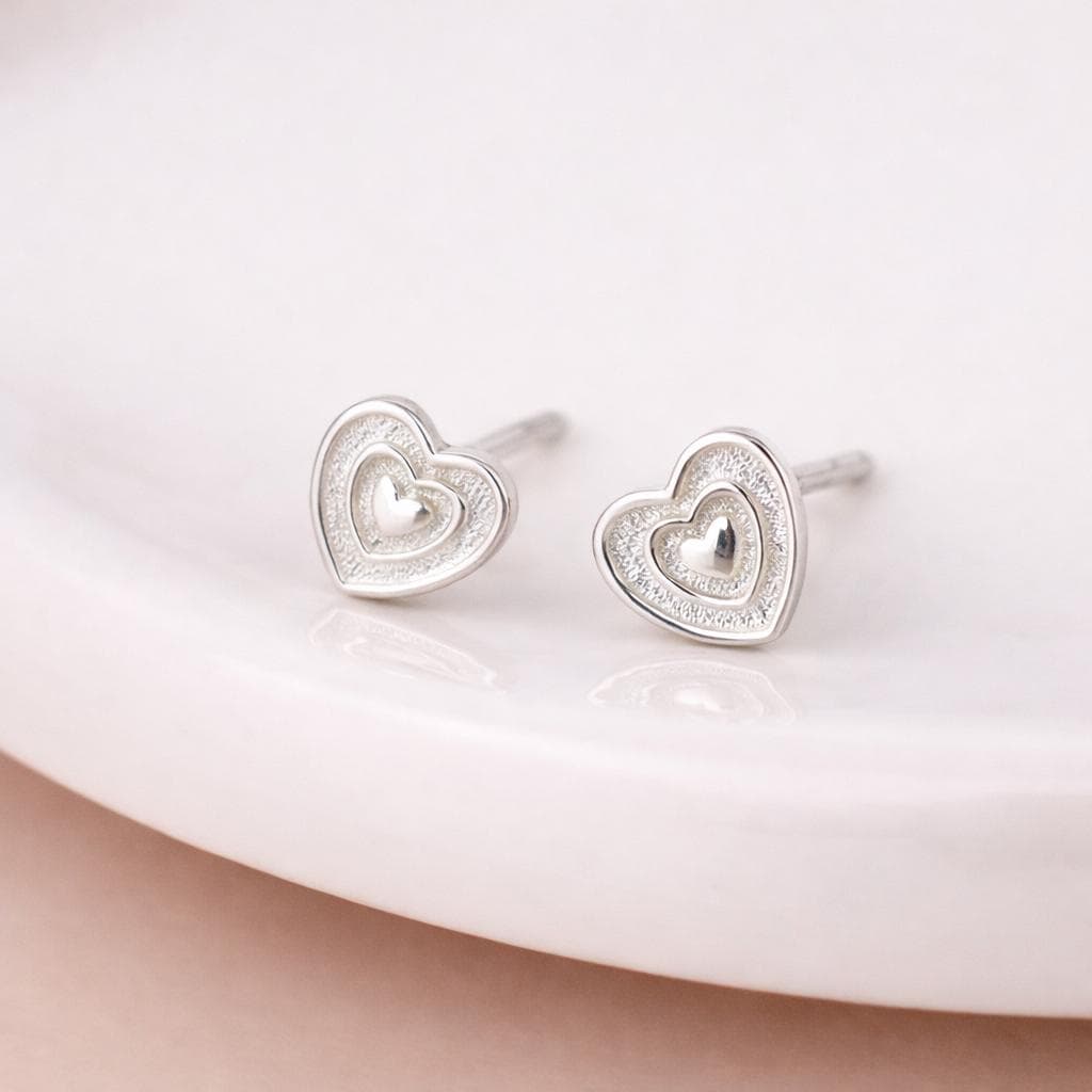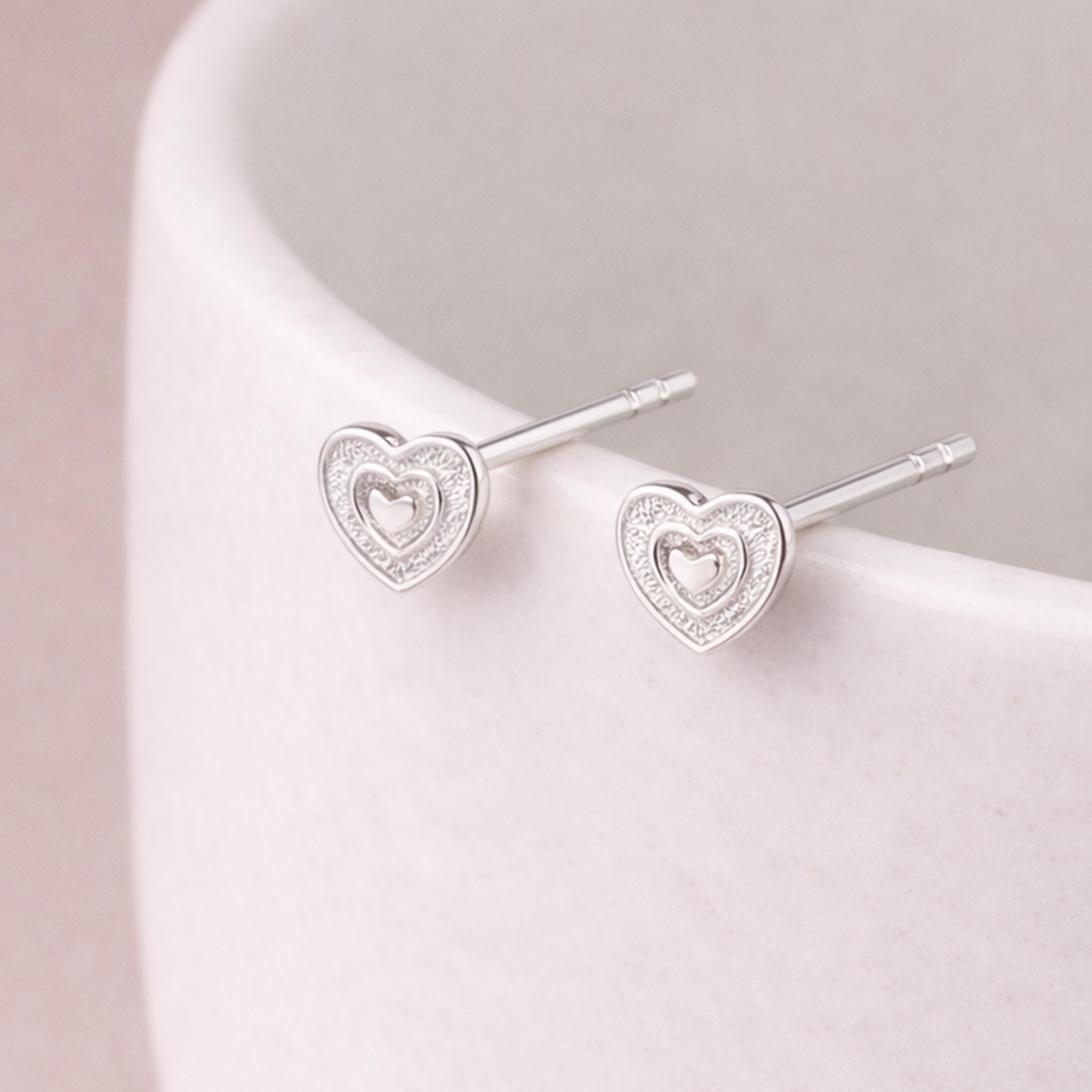 These double heart stud earrings are crafted from solid 925 sterling silver and finished in a bright polished silver tone. Designed with a raised inner heart framed by a softly textured outer heart, they offer a subtle yet meaningful look.