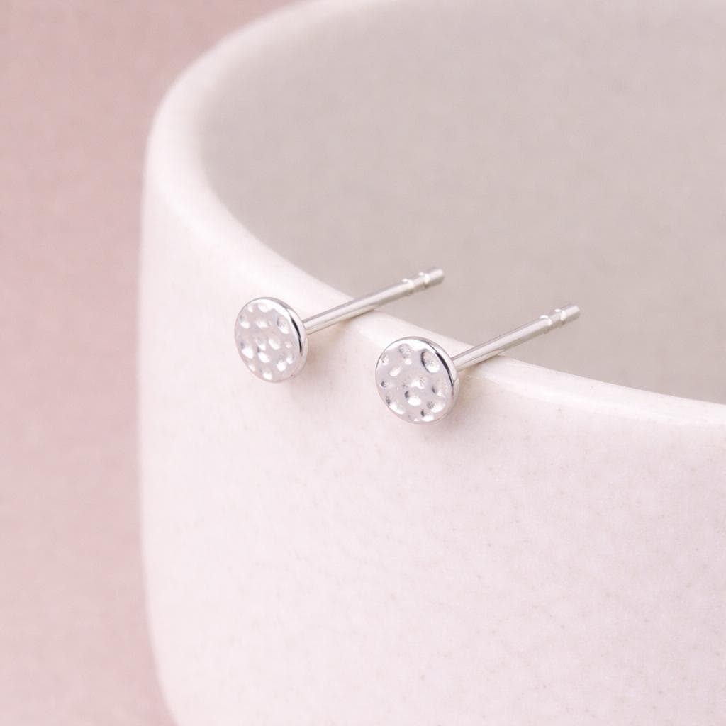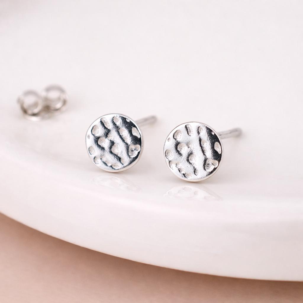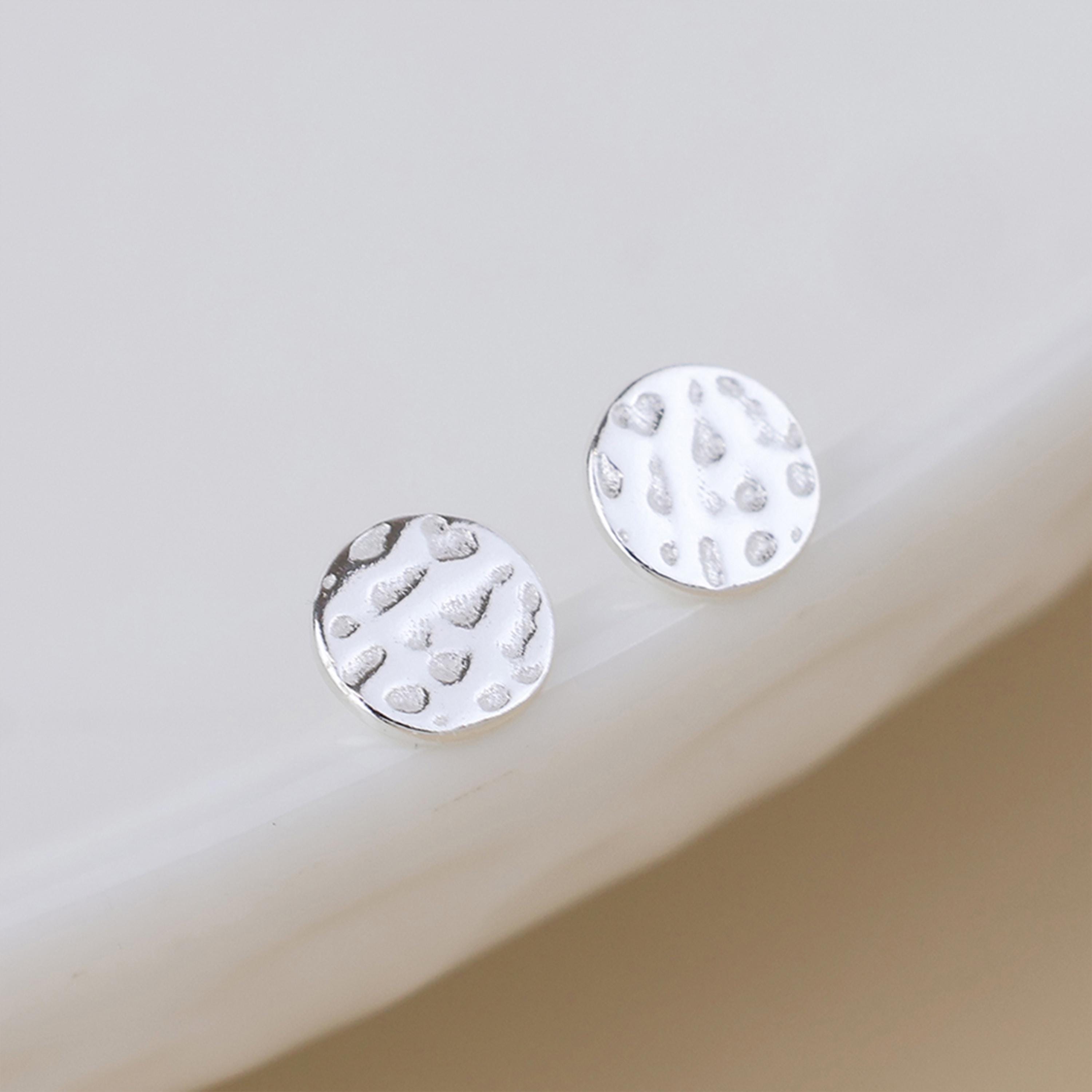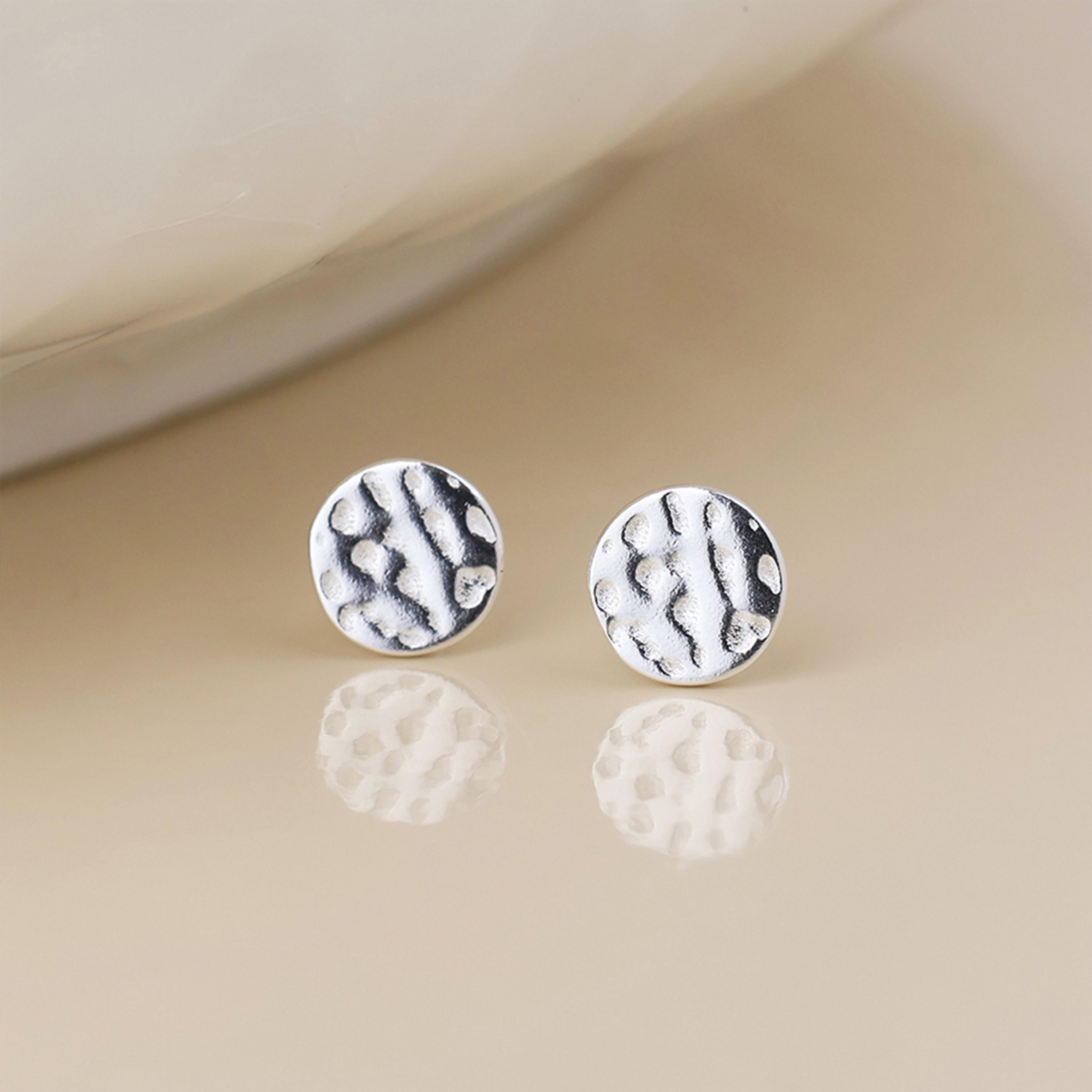 These textured disc stud earrings are crafted from solid 925 sterling silver and finished in a bright polished silver tone. Designed with a softly hammered surface, they catch the light beautifully while keeping a clean, minimalist look.