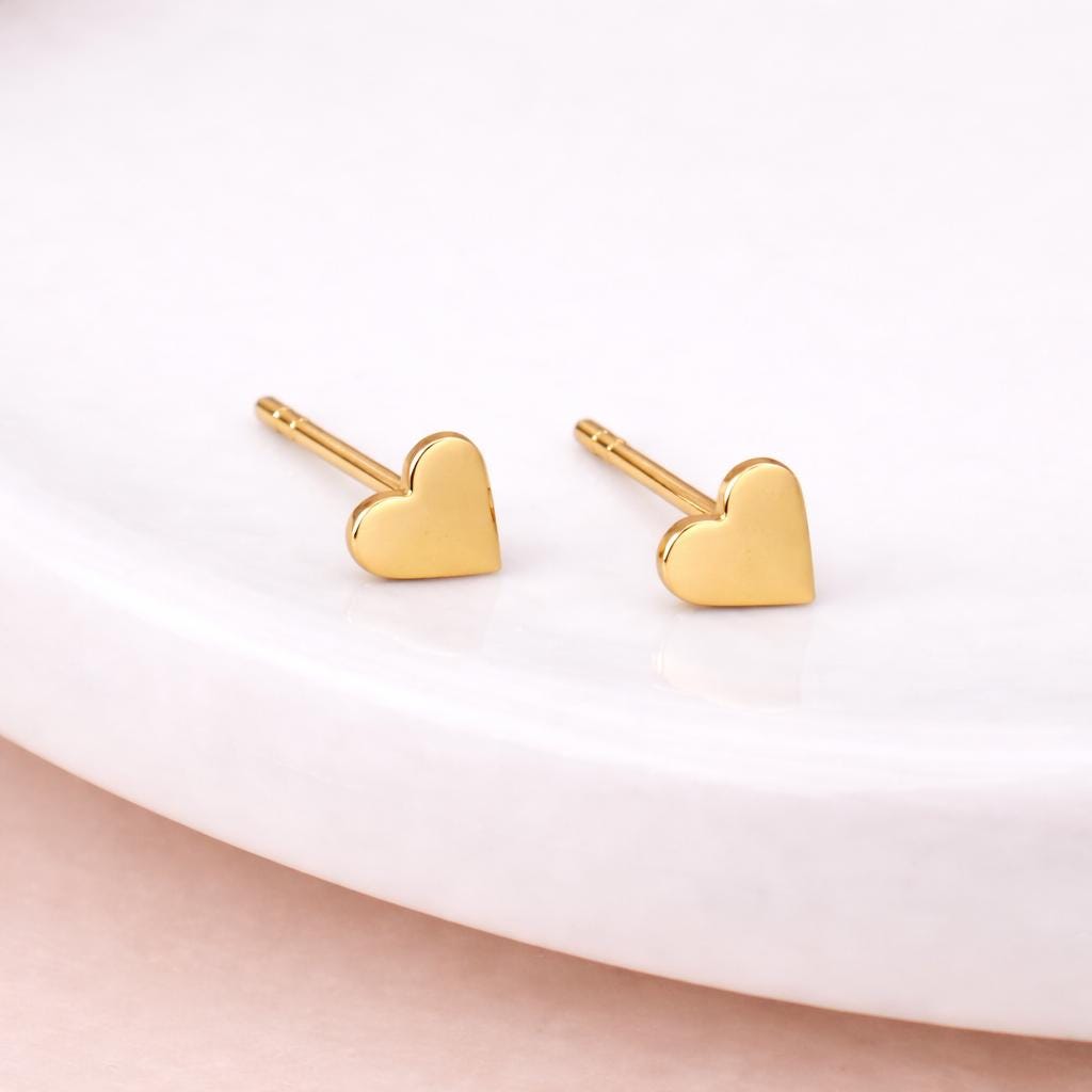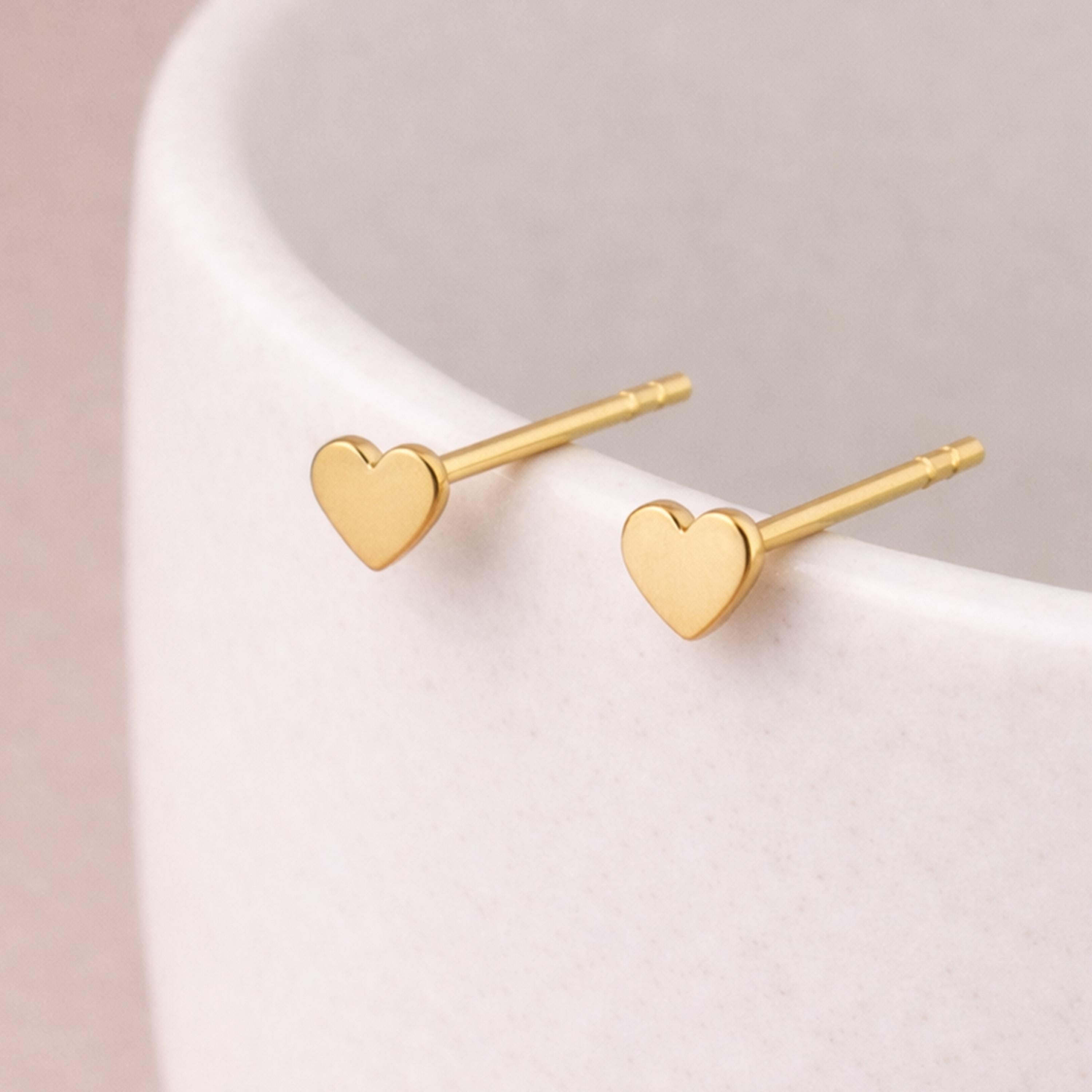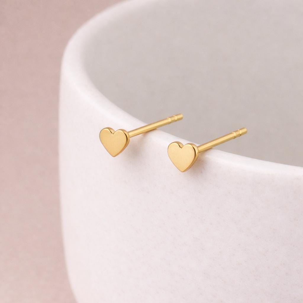 These tiny heart stud earrings are crafted from solid 925 sterling silver and finished with a warm 18ct yellow gold plating, creating a soft, brushed golden glow. Their simple, classic heart silhouette makes them effortlessly wearable and beautifully timeless.