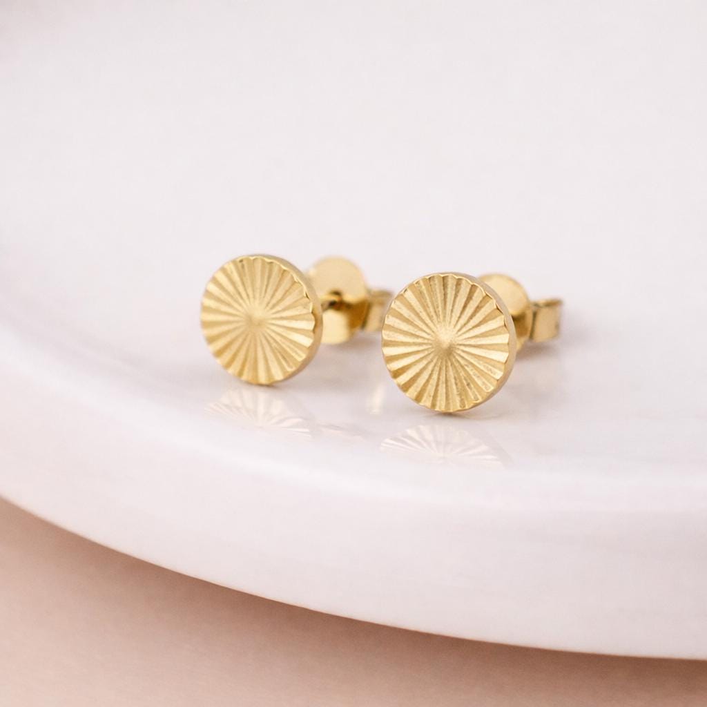 Each stud features a finely cut sunray pattern that radiates from the centre, creating a soft shimmer effect across the surface. The texture is carefully engraved and polished by hand, giving depth and dimension while keeping the overall silhouette clean and minimal. Their smaller 5mm size makes them ideal for everyday wear, second piercings, or creating a curated ear stack.