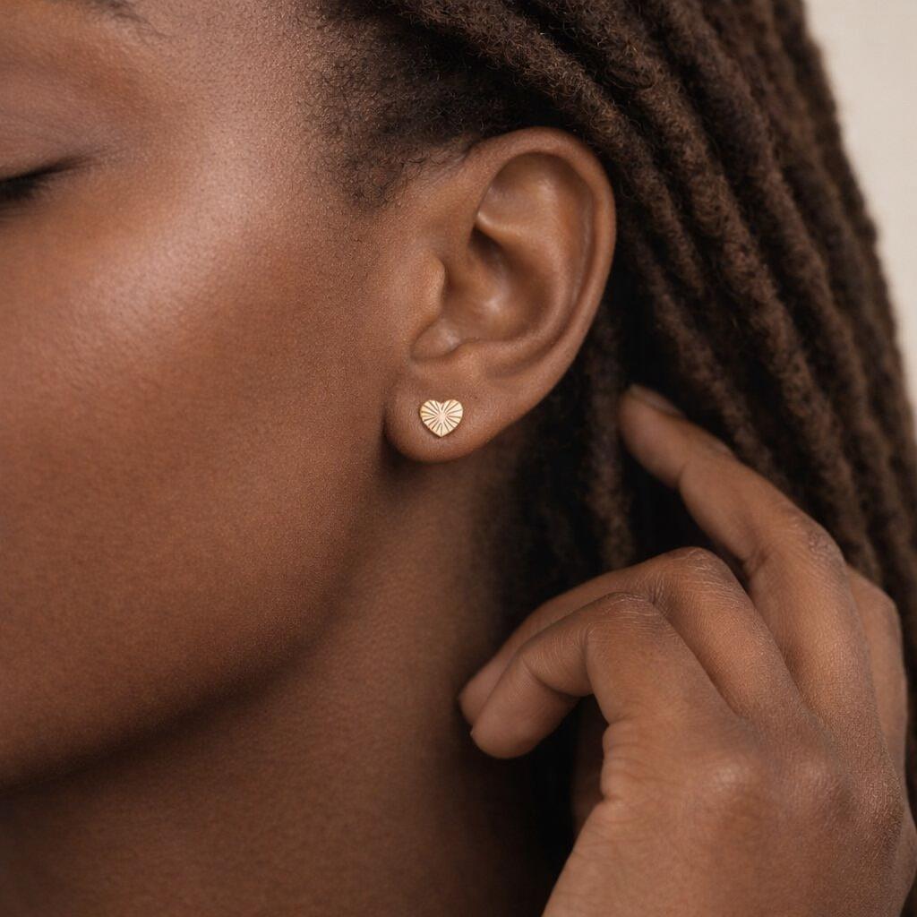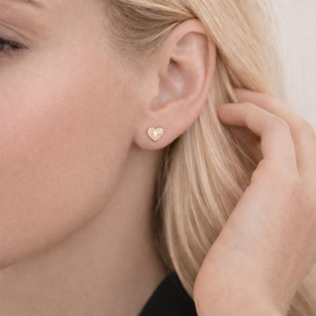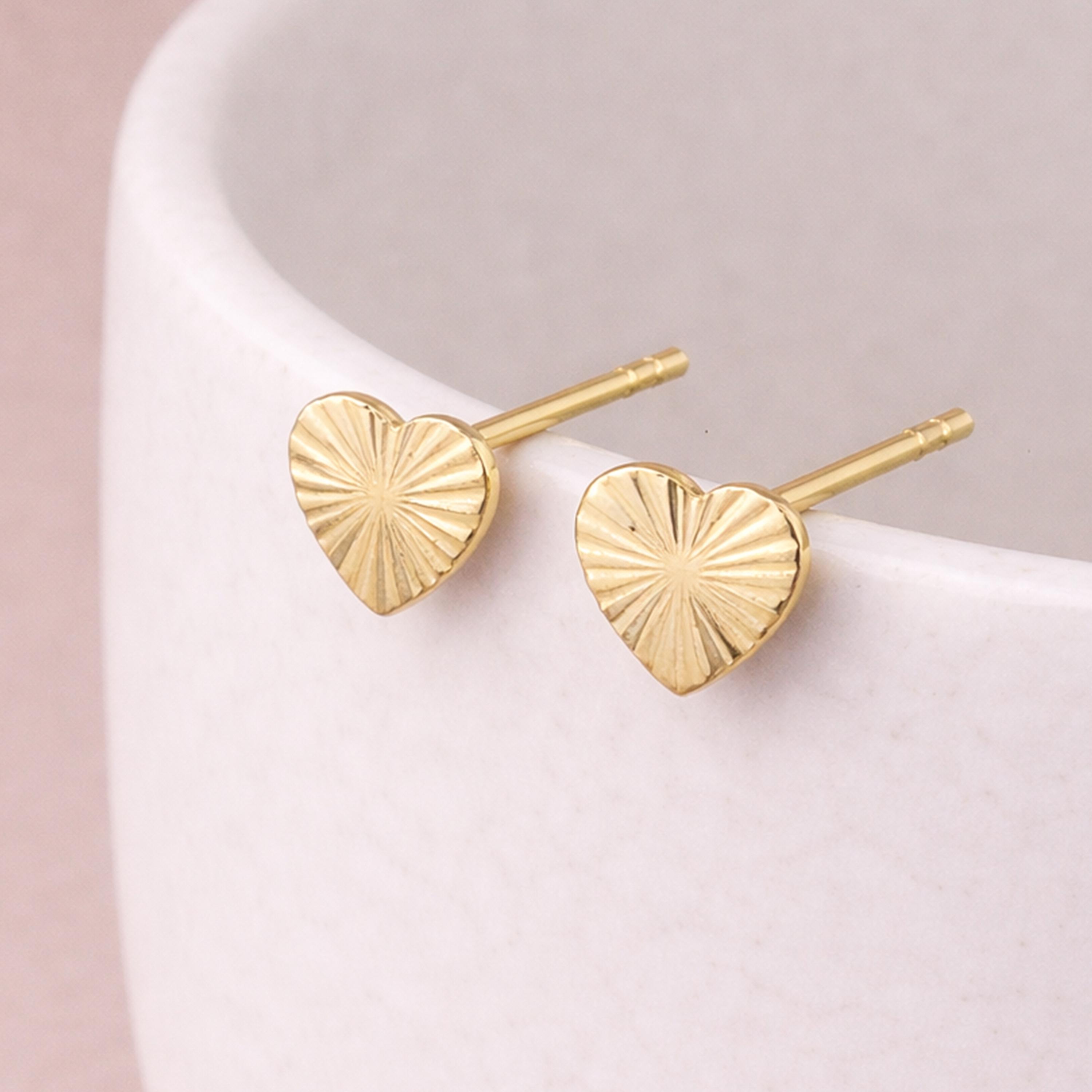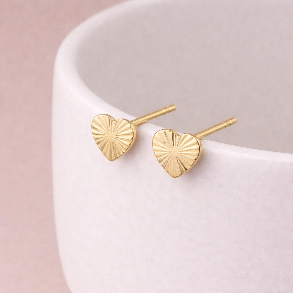 Each heart is engraved with a fine sunburst pattern that radiates from the centre outward, creating a beautiful light catching effect across the surface. The engraving is carefully precision cut and then polished by hand, allowing the gold plated finish to reflect softly and naturally. At 7mm, they are perfectly balanced, noticeable yet still refined enough for everyday wear.