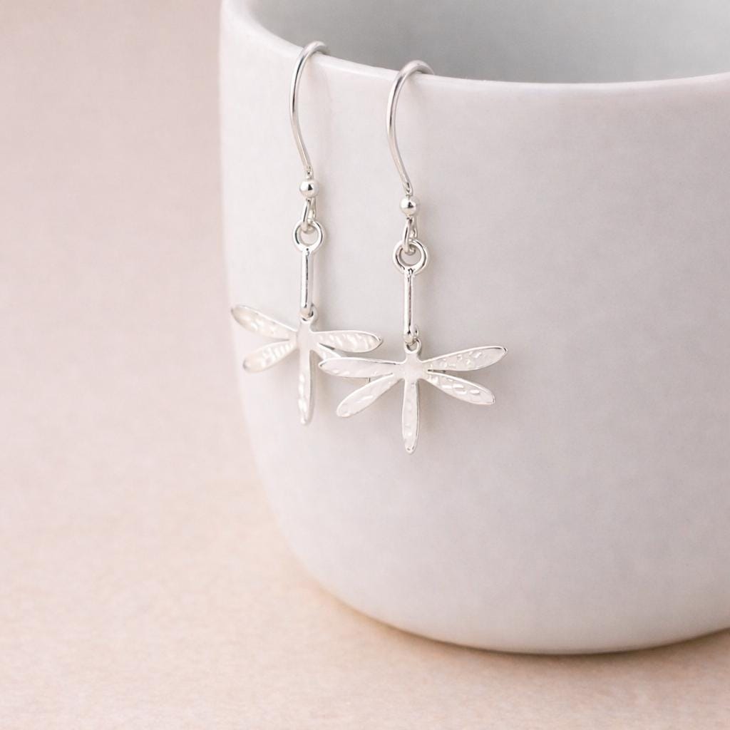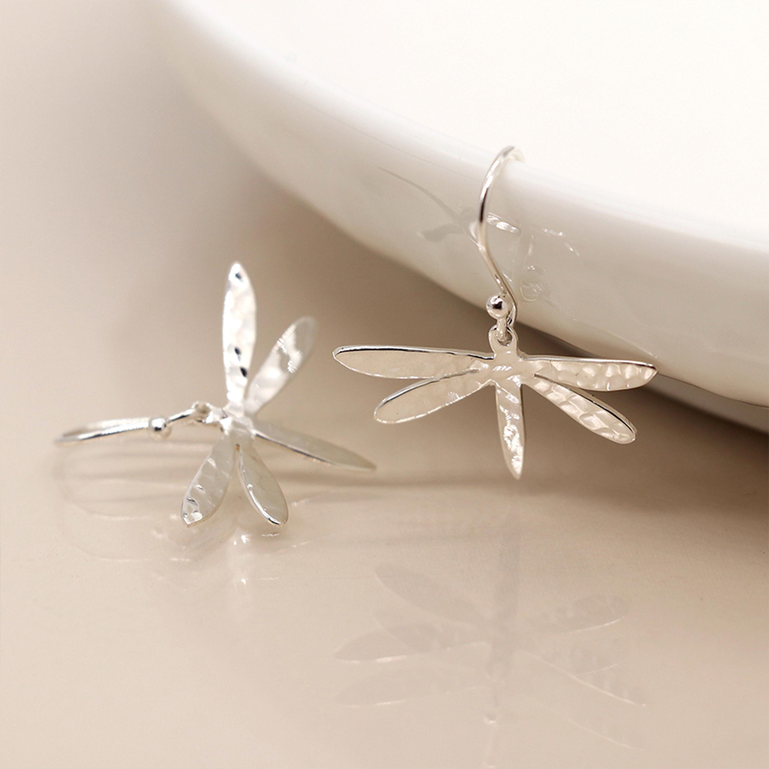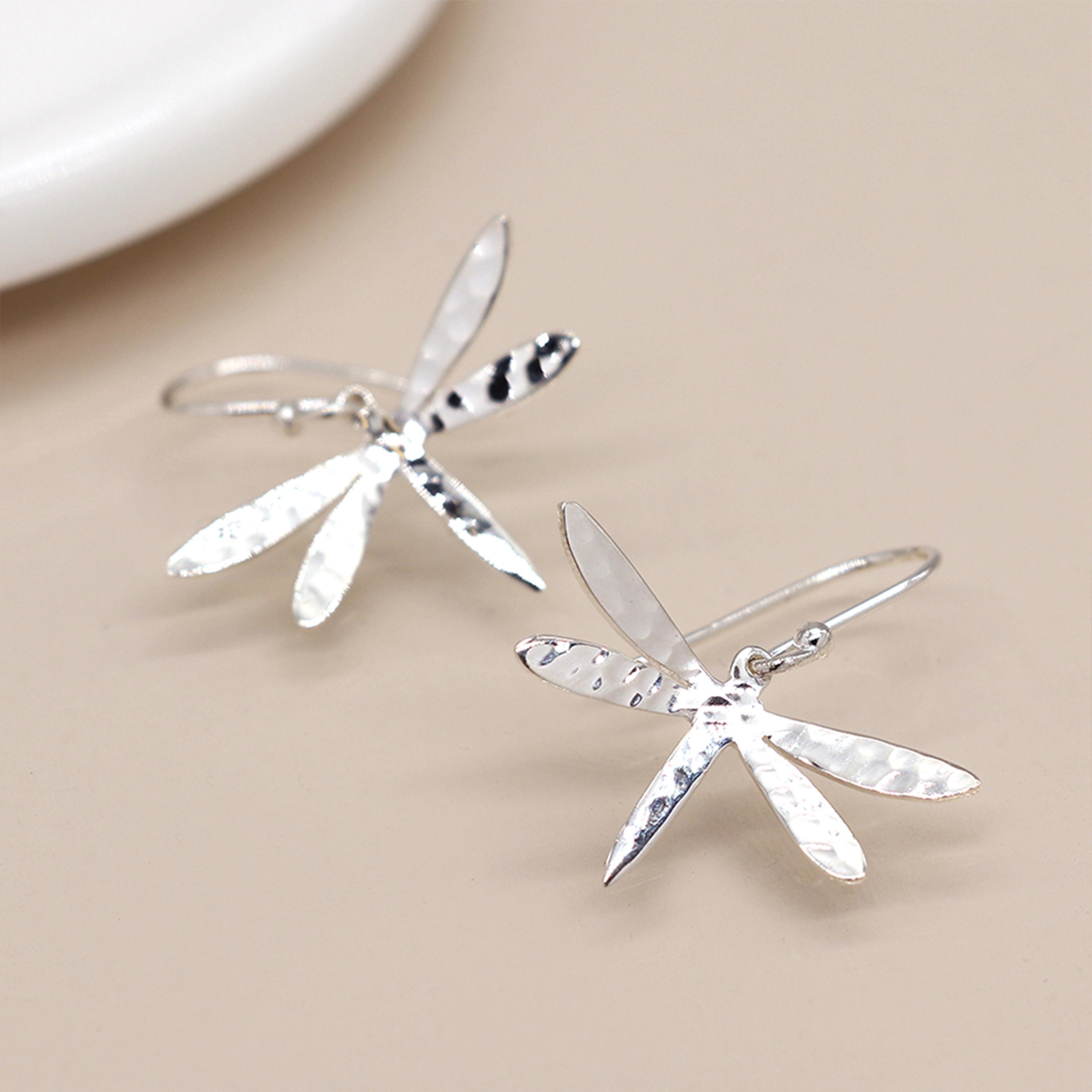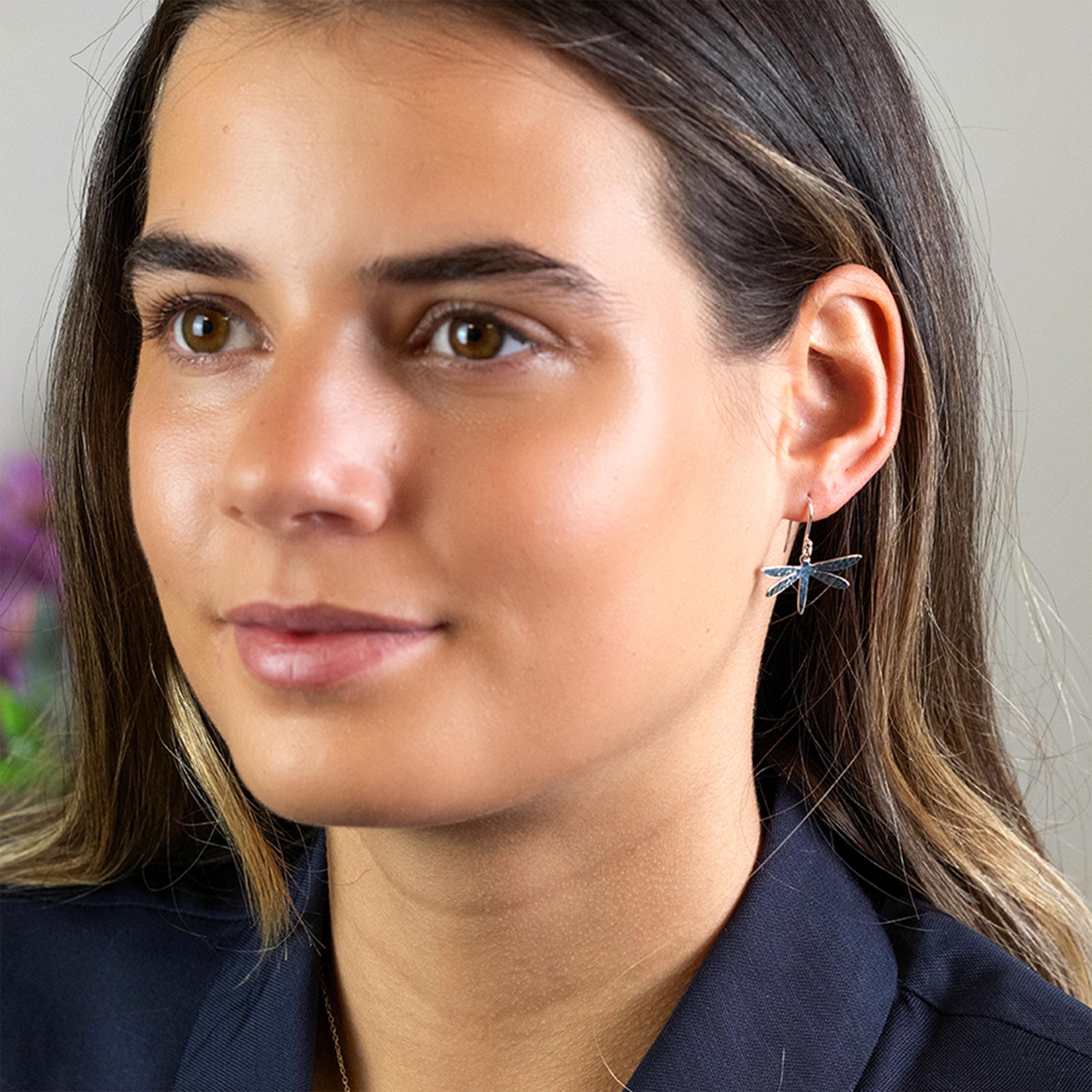 Each dragonfly is carefully shaped with gently textured wings that catch the light as they move. The subtle hammered finish across the wings creates soft reflections, adding depth and character while maintaining a refined silhouette. Suspended from classic sterling silver hook fittings, the design allows the dragonflies to move freely, giving them a light, airy presence when worn.